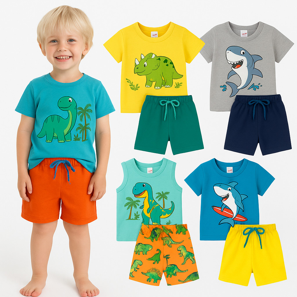 Kit 4 Peças De Roupa Infantil Menino Verão = Kit 2 Camisas + 2 Shorts Masculino Sortidos Kit com 2 ou 1 Conjuntos