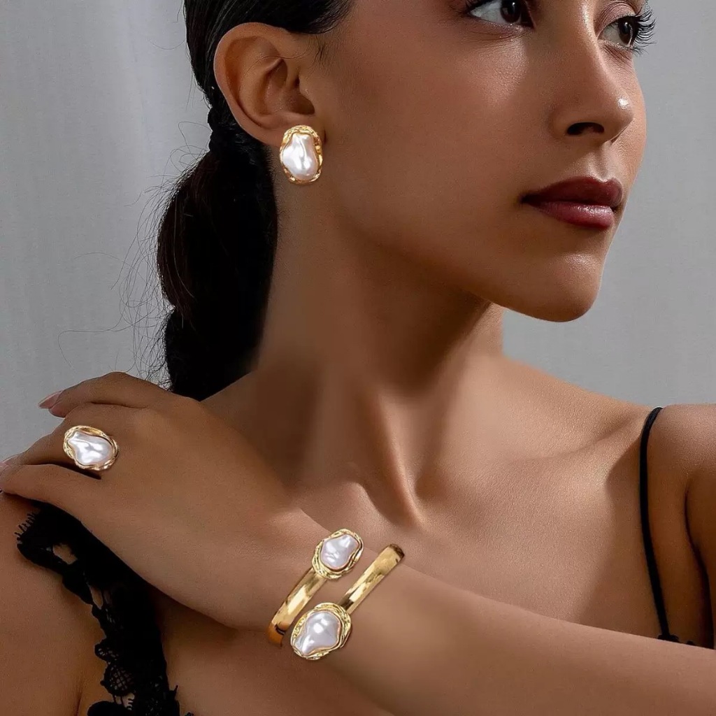 📌 1️⃣ Título do Produto Kit 4 Peças Feminino Brincos Anel e Bracelete com Pedra Estilo Pérola banhado Ouro 18K e Prata925 📌 2️⃣ Descrição do Produto ✨ Destaques do Produto Conjunto completo com 4 peças combinando Detalhe central com pedra estilo pérola Acabamento dourado com moldura texturizada Visual sofisticado e elegante 💎 Design e Estilo Kit composto por par de brincos, anel e bracelete com aplicação de pedra estilo pérola em formato orgânico. O contraste entre o acabamento polido e o detalhe central cria um visual refinado e marcante, ideal para produções elegantes. 🎁 Ocasiões de Uso Perfeito para festas, eventos, ocasiões especiais, jantares e produções formais. Excelente opção para presente. 📌 3️⃣ Especificações do Produto Bracelete: Ajustável: Sim Anel: Ajustável: Sim Brincos: Cor: Ouro e prata Modelo: Pedra estilo pérola Quantidade no kit: 4 peças 📌 4️⃣ Conteúdo da Embalagem 1x Bracelete 1x Anel 1x Par de brincos 📌 5️⃣ Observações Importantes Pode haver pequena variação nas medidas devido à medição manual. As cores podem variar levemente devido à iluminação e tela.