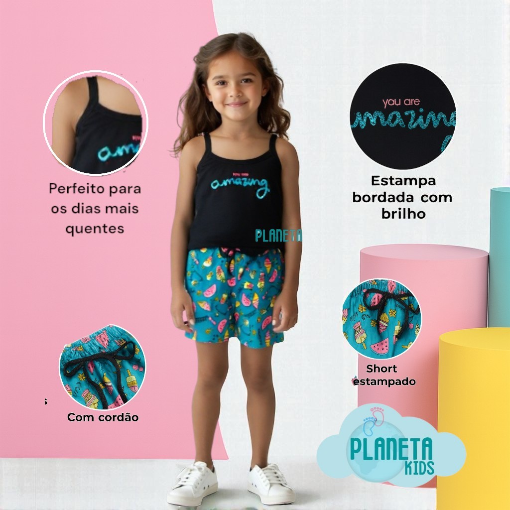 O anúncio contém: 02 blusas bordadas com alças de cotton 02 shorts estampados de cotton com cordão Um conjunto mais lindo que o outro! Com apliques alegres e estilosos, como as crianças gostam! Fácil de lavar! Muito confortável! Tecido de qualidade! Qual tamanho deve escolher? 👧 Tamanho: 1 -- Comprimento Camiseta: 36 cm -- Busto: 24 cm Comprimento Shorts: 20 cm 💖 Indicado para 6-12 meses 👧 Tamanho: 2 -- Comprimento Camiseta: 38 cm -- Busto: 25 cm Comprimento Shorts: 21 cm 💖 Indicado para 1-2 anos 👧 Tamanho: 3 -- Comprimento Camiseta: 39 cm -- Busto: 26 cm Comprimento Shorts: 22 cm 💖 Indicado para 2-3 anos 👧 Tamanho: 4 -- Comprimento Camiseta: 40 cm -- Busto: 27 cm Comprimento Shorts: 23 cm 💖 Indicado para 3-4 anos 👧 Tamanho: 6 -- Comprimento Camiseta: 41 cm -- Busto: 28 cm Comprimento Shorts: 24 cm 💖 Indicado para 4-5 anos 👧 Tamanho: 8 -- Comprimento Camiseta: 42 cm -- Busto: 30 cm Comprimento Shorts: 25 cm 💖 Indicado para 5-6 anos 👧 Tamanho: 10 -- Comprimento Camiseta: 44 cm -- Busto: 32 cm Comprimento Shorts: 26 cm 💖 Indicado para 6-7 anos 👧 Tamanho: 12 -- Comprimento Camiseta: 46 cm -- Busto: 34 cm Comprimento Shorts: 27 cm 💖 Indicado para 7-8 anos 👧 Tamanho: 14 -- Comprimento Camiseta: 48 cm -- Busto: 36 cm Comprimento Shorts: 28 cm 💖 Indicado para 8-11 anos 👧 Tamanho: 16 -- Comprimento Camiseta: 50 cm -- Busto: 38 cm Comprimento Shorts: 29 cm 💖 Indicado para 11-12 anos As medidas podem variar de 1-3 cm. Aconselhamos um número acima do que a criança usa no momento, devido a forma dos nossos fabricantes ser menor. Prezamos pela Satisfação, Confiança e Bem Estar de Nossos Clientes, por isso, só Trabalhamos com Produtos de Excelente Qualidade! Nossas Peças São Confeccionadas com Tecidos de Excelente Qualidade, Proporcionando Conforto, Bem Estar e Durabilidade! GOSTOU? ENTÃO VEJA ABAIXO OBSERVAÇÕES IMPORTANTES! PERGUNTAS FREQUENTES . QUAL TAMANHO DEVO ESCOLHER? R: Aconselhamos um número acima do que a criança usa no momento, devido a forma dos nossos fabricantes ser menor. O TAMANHO É A MESMA COISA QUE A IDADE DA CRIANÇA? R: Não! Cada criança tem seu peso e altura diferentes, escolha um número acima do que ele usa no momento. POSSO ESCOLHER CORES E ESTAMPAS? R: Infelizmente não. Será enviado a estampa e cor sortidas, conforme disponibilidade no estoque. Precisa de Ajuda ou Tem Alguma Dúvida Sobre o(s) Produto(s), Envio ou Garantia? Por Favor, Nos Encaminhe Sua Mensagem Que Responderemos o Mais Breve Possível!