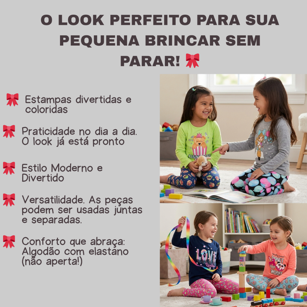 Kit 4 Peças Roupa Infantil Menina Conjunto Infantil Feminino Sortido – 2 Blusas e 2 Legging estampadas Dica de Ouro: 💡 Se a criança estiver entre dois tamanhos, escolha sempre o maior para garantir o conforto e aquela folguinha gostosa para brincar! • Kit composto por: 2 Blusas e 2 leggings • Disponível nos tamanhos 1 a 8 anos • Composição: 85% algodão como mínimo Conforto garantido com tecido leve, fresquinho e agradável para os dias mais quentes. Ideal para brincar, passear ou curtir o dia com muito estilo e liberdade. Atenção: Produto enviado com estampas sortidas, sem opção de escolha. As estampas e cores podem variar das fotos, mas sempre com a mesma qualidade, conforto e beleza. Cuidados na lavagem: • Não alvejar • Não lavar a seco • Passar em baixa temperatura 📏 Tabela de Medidas (As medidas podem variar até 2 cm) Qual tamanho deve escolher? 👧 Tamanho: 1 -- CAMISETA Comprimento: 33cm -- Busto: 25cm -- Manga: 27cm CALÇA Comprimento: 46cm – Cintura: 18cm 💖Indicado para 6-12 meses 👧 Tamanho: 2 -- CAMISETA Comprimento: 36cm -- Busto: 26cm -- Manga: 30cm CALÇA Comprimento: 52cm – Cintura: 20cm 💖Indicado para 1-2 anos 👧 Tamanho: 3 -- CAMISETA Comprimento: 38cm -- Busto: 27cm -- Manga: 33cm CALÇA Comprimento: 57cm – Cintura: 21cm 💖Indicado para 2-3 anos 👧 Tamanho: 4 -- CAMISETA Comprimento: 44cm -- Busto: 30cm -- Manga: 37cm CALÇA Comprimento: 63cm – Cintura: 23cm 💖Indicado para 3-4 anos 👧 Tamanho: 6 -- CAMISETA Comprimento: 47cm -- Busto: 32cm -- Manga: 39cm CALÇA Comprimento: 65cm – Cintura: 25cm 💖Indicado para 4-5 anos 👧 Tamanho: 8 -- CAMISETA Comprimento: 49cm -- Busto: 34cm -- Manga: 42cm CALÇA Comprimento: 68cm – Cintura: 26cm 💖Indicado para 5-6 anos Atenção Mamães: 💖 As medidas de busto referem-se apenas à parte da frente da peça. Para saber a circunferência total, é só dobrar o valor! As medidas podem variar em até 2cm para mais ou para menos. Aconselhamos um número acima do que a criança usa no momento, devido a forma dos nossos fabricantes ser menor. PERGUNTAS FREQUENTES . QUAL TAMANHO DEVO ESCOLHER? R: Aconselhamos um número acima do que a criança usa no momento, devido a forma dos nossos fabricantes ser menor. O TAMANHO É A MESMA COISA QUE A IDADE DA CRIANÇA? R: Não! Cada criança tem seu peso e altura diferentes, escolha um número acima do que ele usa no momento. POSSO ESCOLHER CORES E ESTAMPAS? R: Não. Será enviado a estampa e cor sortidas, conforme disponibilidade no estoque. Renove o guarda-roupa da sua pequena com este super kit de conjuntos femininos. As peças são práticas, coloridas e confortáveis — perfeitas para o dia a dia, passeios e brincadeiras.