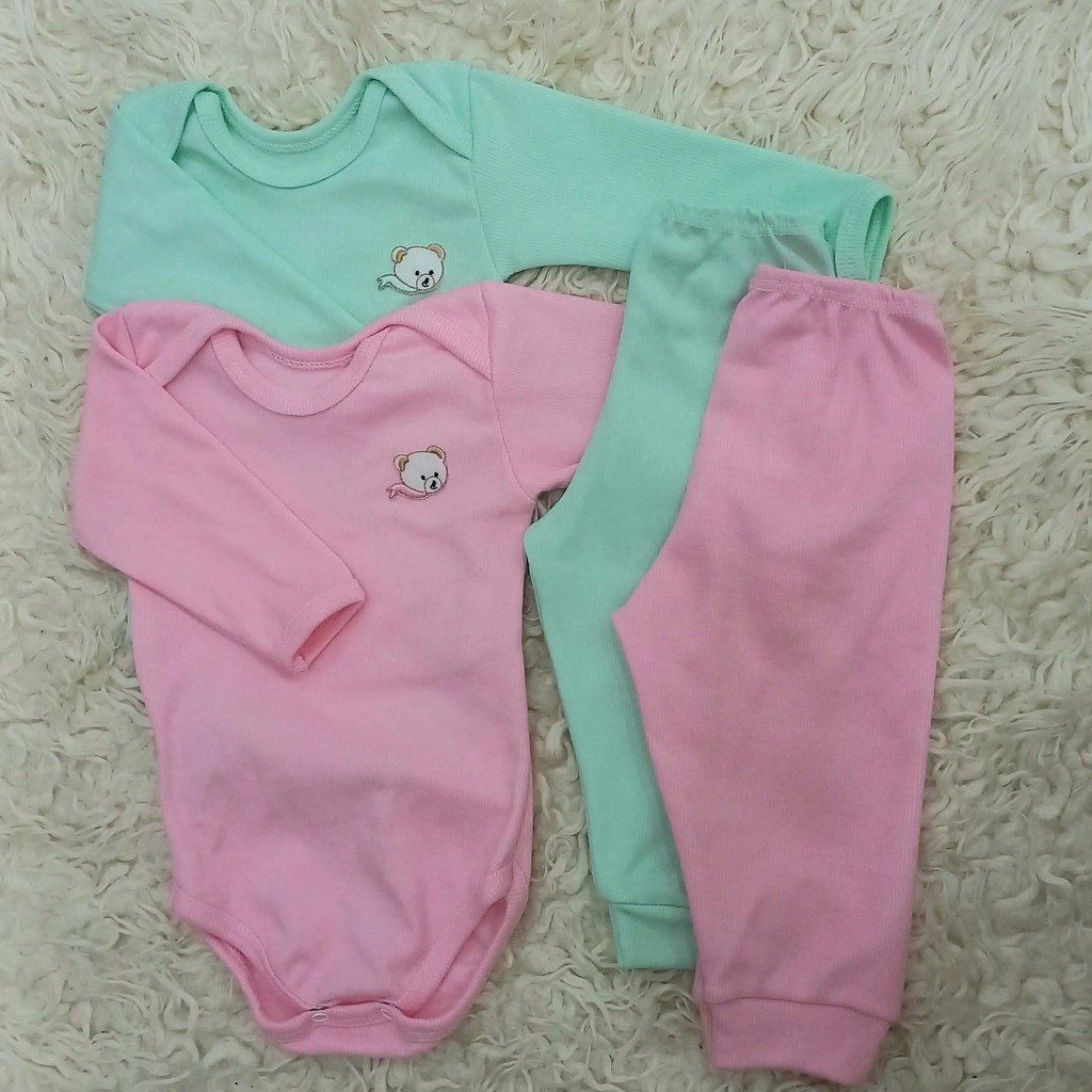Kit 4 peças, composto por 2 body de manga longa e 2 mijão. Perfeitos para todas as estações. Macios, respiráveis e delicados para a pele sensível do bebê. Material : Algodão macio Kit Com : 2 body + 2 mijão **Detalhe especial** : Aplique bordado em cada body Design confortável, Fácil de vestir e ideal para todas as ocasiões !! Perfeito para presentear ou compor o enxoval do bebê!