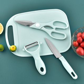 Kit 4 Peças Para Cozinha - Faca Tesoura Descascador Tábua Culinária Inox