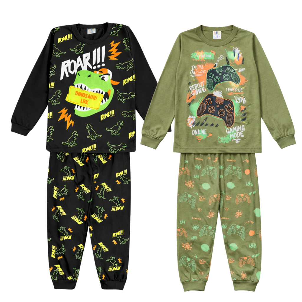 Roupa de dormir pijama longo para meninos. O Kit 4 peças INVERNO é composto por 2 calças + 2 blusas manga longa = 2 conjuntos. O Pijama infantil para menino é macio, resistente e confortável. Tão lindos que podem ser usados para sair e tão confortáveis que podem ser usados para dormir. Serão enviados 2 conjuntos de cores diferentes e estampas diferentes. Para escolher o tamanho adequado deve-se olhar a tabela de medidas (última foto) e comparar as medidas com uma roupa da criança. O tamanho não se refere à idade. 2 camisas manga longa confeccionadas em malha de algodão com punhos nas mangas para melhor ajuste. 2 calças compridas confeccionadas em malha de algodão com elástico na cintura e punho na barra para melhor ajuste e conforto. ATENÇÃO - IMPORTANTE! • Não há opção de escolha dos modelos. • Os modelos enviados serão sortidos conforme a disponibilidade em estoque. LAVAGEM: Como o tecido é de algodão, é natural que encolha um pouquinho na primeira lavagem. Deve sempre secar à sombra para manter sempre as cores vivas das estampas. Foto real do produto.