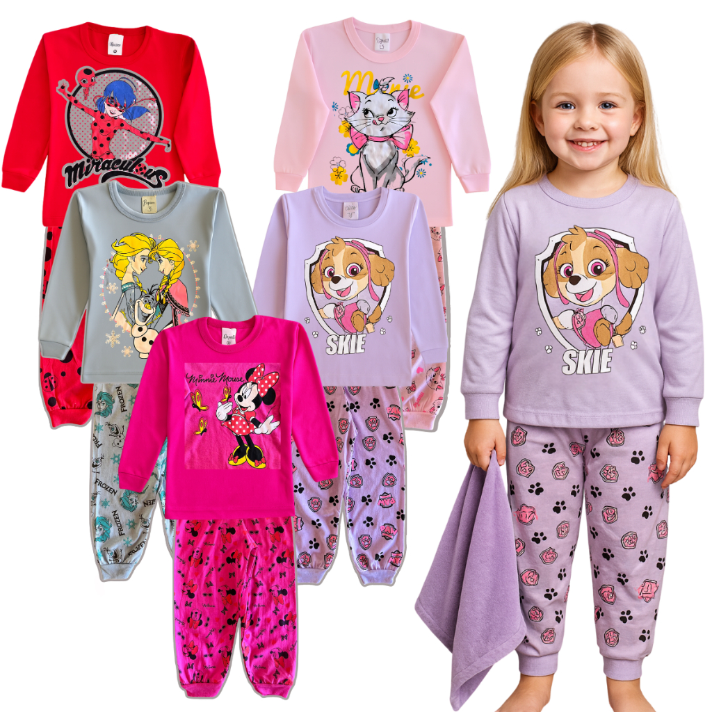 Roupa de dormir longo outono/inverno. Tecido fresco, ideal para meia estação ou dormir com ar condicionado. O Kit de 4 peças é composto por 2 calças + 2 blusas = 2 conjuntos. Serão enviados conjuntos de cores diferentes e estampas diferentes. O Pijama infantil para menina é macio, resistente e confortável ideal para meia estação e inverno. 2 camisas manga longa confeccionadas em malha 100% algodão. 2 calças compridas confeccionadas em malha 100% algodão com elástico na cintura para melhor ajuste e conforto. Para escolher o tamanho adequado deve-se olhar a tabela de medidas (última foto) e comparar as medidas com uma roupa da criança. O tamanho não se refere à idade. ATENÇÃO - IMPORTANTE! • Não há opção de escolha dos modelos. • Os modelos enviados serão sortidos conforme a disponibilidade em estoque. • A fábrica muda a combinação estampa/cor a cada remessa. • As 7 fotos do anúncio são exemplos de estampas/cor. ATENÇÃO: Recebemos novidades toda semana, com isso podemos enviar conjuntos diferentes do que estão nas fotos, mas sempre com o mesmo nível de qualidade e beleza. LAVAGEM: Como o tecido é 100% algodão, é natural que encolha um pouquinho na primeira lavagem. Aconselhamos lavar separado e deve sempre secar à sombra para manter as cores vivas das estampas. TAMANHO: Verifique a tabela de medidas. O tamanho não se refere a idade. Foto real do produto. Segue uma SUGESTÃO para escolha de tamanho: Tamanho 1 = veste 6 meses a 1 ano Tamanho 2 = veste 1 a 2 anos Tamanho 3 = veste 2 a 3 anos Tamanho 4 = veste 3 a 4 anos Tamanho 6 = veste 4 a 6 anos Tamanho 8 = veste 6 a 8 anos Tamanho 10 = veste 8 a 10 anos ATENÇÃO: Esse é um anúncio com ESTOQUE NA SHOPEE. Isso significa que os produtos já ficam embalados e prontos no galpão da shopee, para que a entrega seja muito mais rápida para você (FULL). Os funcionários da shopee não visualizam as estampas que estão no pacote e não tem autorização para alterar.