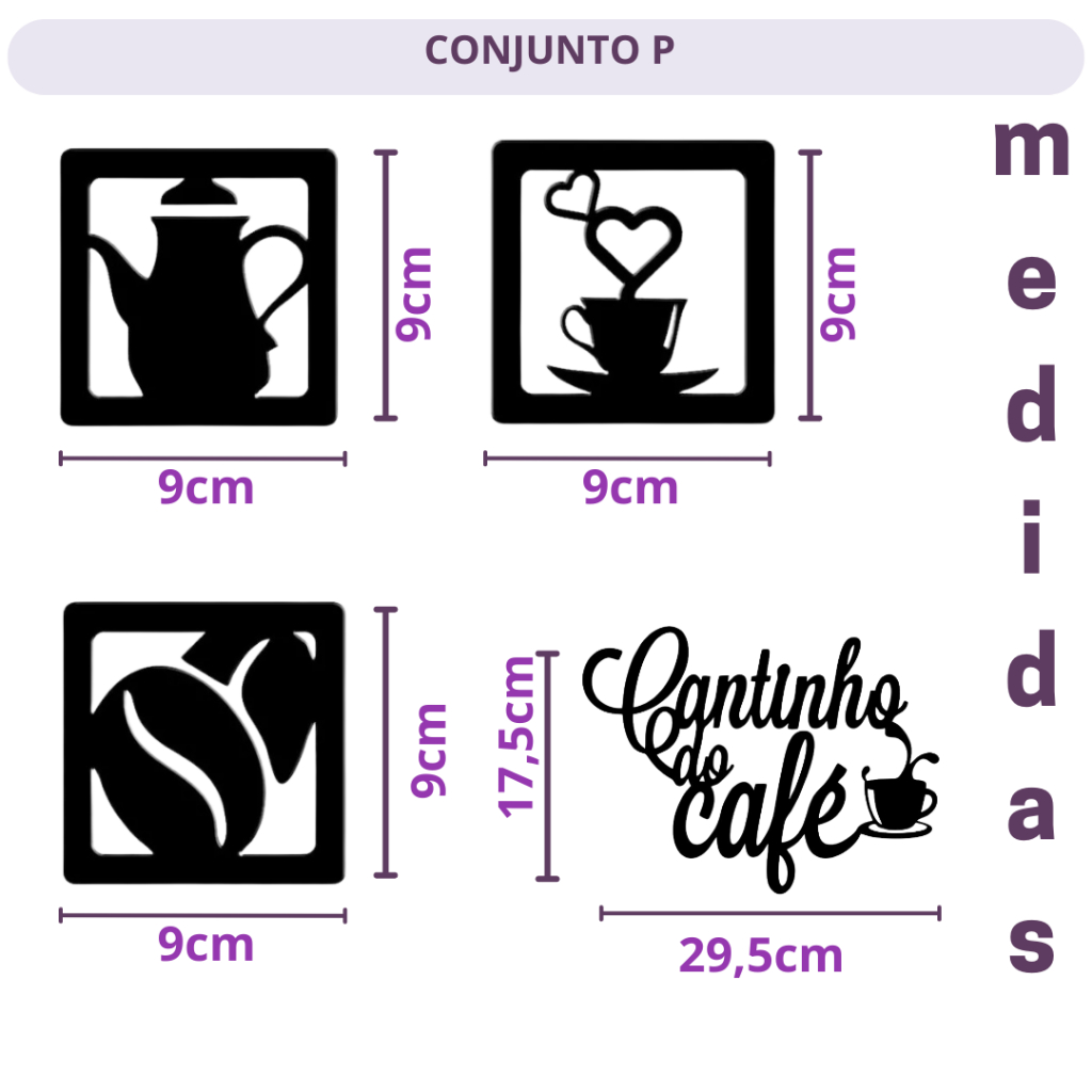Apresentamos o nosso incrível Kit de Apliques de Parede Cantinho do café 4 peças em MDF Preto. O kit de parede decorativo é uma excelente opção para você personalizar seu cantinho do café e atribuir um toque especial na decoração de sua casa. Você pode montar do seu jeito, brincando com as diferentes possibilidades. O kit acompanha três quadros no tema, sendo um de grãos de café, um de xícara com coração, outro de um lindo bule e um Letreiro escrito Cantinho do Café. As peças são feitas em MDF de altíssima qualidade, Madeira 100% de reflorestamento, que contribui para a sustentabilidade do meio ambiente e são leves, não sendo necessários pregos ou furos para instalar. A instalação é bem simples, não será preciso fazer sujeira furando a parede, basta aplicar no local utilizando a fita dupla face. Não perca tempo e transforme hoje mesmo o seu espaço com nosso kit decorativo! Material: Mdf. Medidas: Tamanho P Quadros: 9cmX9cm Aplique Cantinho do Café: Comprimento: 29,5cm Altura: 17,5cm Tamanho G: Quadros: 20cmX20cm Aplique Cantinho do Café: Comprimento: 40cm Altura: 20cm O kit acompanha 3 quadros e um aplique cantinho do café. SELECIONE VARIAÇÃO DE TAMANHO!!!! Envio imediato para todo o Brasil. SOMOS LOJA FISICA! Oferecemos Garantia, compre com total tranquilidade. Oferecemos o melhor atendimento! Estamos a disposição no chat para esclarecer qualquer dúvida e trabalhamos para garantir a melhor experiência para todos os nossos clientes. OBS: Não acompanha itens de decoração das fotos. EMBALAGEM: Embalamos nossos produtos seguindo todos os protocolos de segurança, além de muito cuidado e carinho para que ele chegue na sua casa perfeito, sem nenhuma avaria. Mas caso algo não ocorra conforme o esperado, não se preocupe! Estamos aqui para resolver o mais rápido possível, é só entrar em contato.