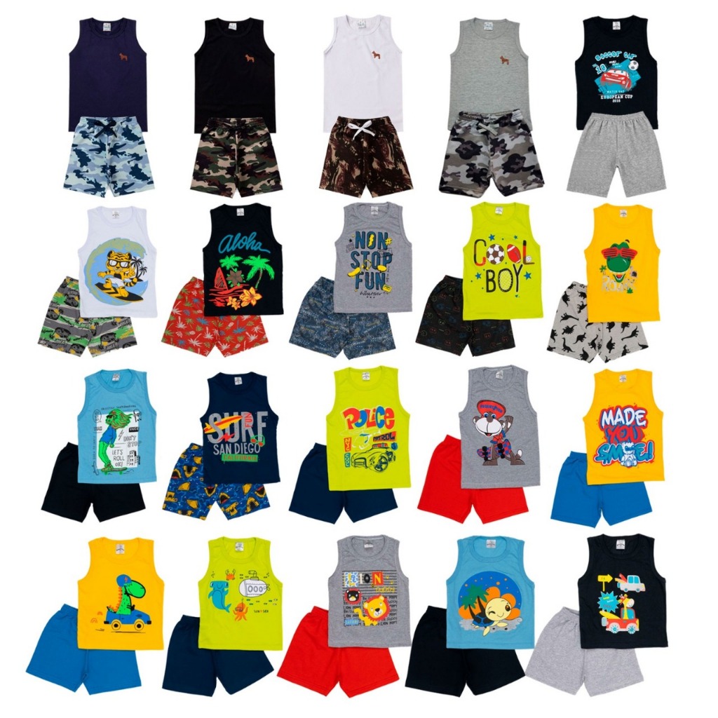 kit com 4 peças de roupas masculinas infantis e juvenis variadas estação primavera verão, sendo 2 bermudas em moletinho estampadas ou lisas e 2 camisas em meia malha estampadas ou com aplique. Não será permitido escolha de estampas e cores, o kit vai sortido e sem repetição. Composição do shorts: 50% algodão, 50% Poliéster. Composição da camiseta: 50% algodão, 50% Poliéster. GUIA DE TAMANHOS E MEDIDAS As medidas se referem a frente das peças, compare as medidas da tabela com uma peça que você tenha em casa. COMPOSIÇÃO 50% ALGODÃO - 50% POLIESTER - 85% TAMANHO 1 REGATA: TÓRAX 25cm, ALTURA 35cm BERMUDA: CINTURA 20cm, ALTURA 22cm TAMANHO 2 REGATA: TÓRAX 27cm, ALTURA 37cm BERMUDA: CINTURA 21cm, ALTURA 25cm TAMANHO 3 REGATA: TÓRAX 28cm, ALTURA 39cm BERMUDA: CINTURA 22cm, ALTURA 26cm TAMANHO 4 REGATA: TÓRAX 29cm, ALTURA 42cm BERMUDA: CINTURA 23cm, ALTURA 27cm TAMANHO 6 REGATA: TÓRAX 30cm, ALTURA 43cm BERMUDA: CINTURA 24cm, ALTURA 30cm TAMANHO 8 REGATA: TÓRAX 33cm, ALTURA 46cm BERMUDA: CINTURA 25cm, ALTURA 33cm TAMANHO 10 REGATA: TÓRAX 36cm, ALTURA 49cm BERMUDA: CINTURA 27cm, ALTURA 38cm TAMANHO 12 REGATA: TÓRAX 38cm, ALTURA 50cm BERMUDA: CINTURA 30cm, ALTURA 39cm TAMANHO 14 REGATA: TÓRAX 41cm, ALTURA 52cm BERMUDA: CINTURA 32cm, ALTURA 43cm TAMANHO 16 REGATA: TÓRAX 42cm, ALTURA 53cm BERMUDA: CINTURA 34cm, ALTURA 44cm