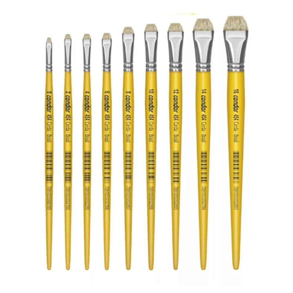 Kit Pincel Série 454 Chato Curto Lixado Condor Números: 2, 8, 12 e 14 (1 UNIDADE CADA) Anatômico, confortável e econômico. Material: Plástico resistente a solventes