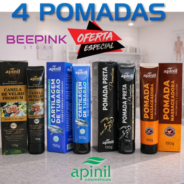 4 unidades kit apinil 1 unidade pomada apinil preta 150g 1 unidade pomada mulateiro(sucupira) 150g apinil 1 unidade pomada canela velho 150 apinil 1 unidade pomada tubarao 150g apinil *Utilização após um dia inteiro de trabalho, treinos intensos e estresse do dia a dia *Massagear pés, pernas, costas e áreas do corpo para relaxamento e redução de dores *Idosos e pessoas com dores crônicas, alivio imediato * Sensação maravilhosa de bem estar e realização Benefícios comprovados: *Auxilia na circulação e alta eficácia no resultado das massagens concentradas *Ótima sensação térmica quente e frio, proporcionando relaxamento extremo *Redução de cansaço e fadiga muscular * Efeito muito rápido