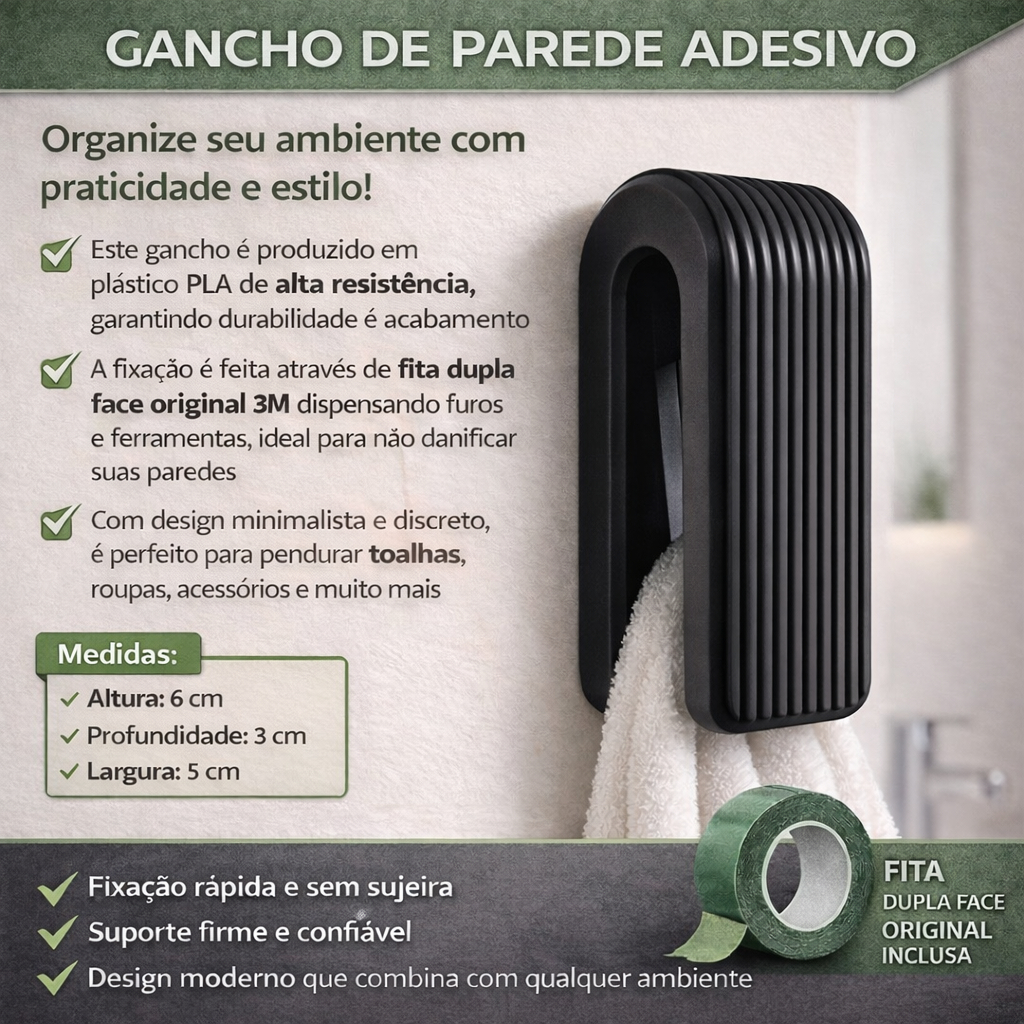 Organize seu espaço de forma inteligente e sem complicação. O Gancho Multiuso é a solução prática para quem quer mais organização no dia a dia sem furar parede ou perder tempo com instalações complexas. Com design compacto e moderno, ele ocupa pouquíssimo espaço (apenas 5 cm), mas entrega alta eficiência. Ideal para pendurar toalhas, panos, roupas e acessórios, mantendo tudo sempre acessível e bem organizado. Disponível nas cores preto, bege, branco e verde, combina facilmente com qualquer ambiente, trazendo um toque discreto e elegante para banheiro, cozinha, lavanderia ou quarto. Fabricado em material resistente, suporta o uso diário sem deformar, sendo perfeito para quem busca durabilidade e funcionalidade no mesmo produto. Você ainda pode escolher o kit ideal para sua necessidade: 2, 4 ou 6 unidades, garantindo organização completa em todos os ambientes da casa. Principais vantagens: Produto compacto e eficiente, ideal para espaços pequenos Fácil instalação, sem complicação Alta durabilidade para uso contínuo Design moderno que combina com qualquer decoração Versátil: use em diversos ambientes Perfeito para quem quer praticidade, organização e um ambiente mais funcional sem gastar muito.