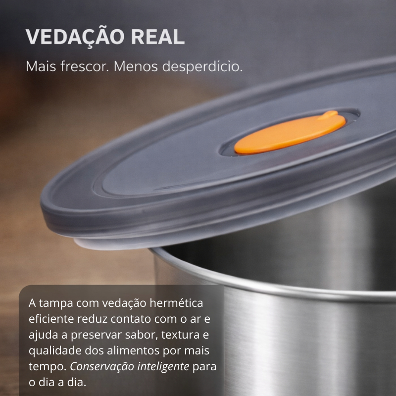 Inox Preserve™ é o sistema inteligente de conservação em aço inox que eleva o padrão da sua cozinha e mantém seus alimentos frescos por muito mais tempo. Chega de abrir a geladeira e encontrar potes despadronizados, manchados e com cheiro desagradável. Chega de plástico deformado, tampas frouxas e alimentos perdendo textura e sabor antes do tempo. A desorganização visual incomoda, o desperdício pesa no bolso e a falta de vedação compromete a qualidade da sua comida. Você merece mais do que improviso. O Inox Preserve™ foi criado para quem quer organização real, higiene superior e durabilidade de verdade. Fabricado em aço inox resistente, com tampa de vedação eficiente, ele reduz o contato com o ar e ajuda a preservar frescor, textura e qualidade dos alimentos. Além de funcional, traz um visual moderno e sofisticado que transforma a sua geladeira em um ambiente organizado e elegante. Por que comprar o Inox Preserve™? Porque organização e conservação não são luxo — são padrão. ✔️ Ele substitui o plástico frágil por resistência duradoura. ✔️ Ele não absorve odores e não mancha com molhos. ✔️ Ele mantém o frescor por mais tempo e reduz desperdício. ✔️ Ele otimiza espaço com formato compacto e empilhável. ✔️ Ele transmite organização e padrão elevado na sua cozinha. ✔️ Ele facilita sua rotina e economiza tempo. ✔️ Ele transforma a aparência da sua geladeira instantaneamente. 📏 Medidas: 5,8 cm altura x 11,5 cm diâmetro (cada unidade – 450ml) 🛡️ Materiais: Aço inox + Tampa plástica com vedação ⚠️ ATENÇÃO: O Inox Preserve™ está disponível em lote limitado. Quando o estoque acabar, o próximo poderá sofrer reajuste. 🔥 Garanta agora seu kit com 4 unidades antes que acabe.