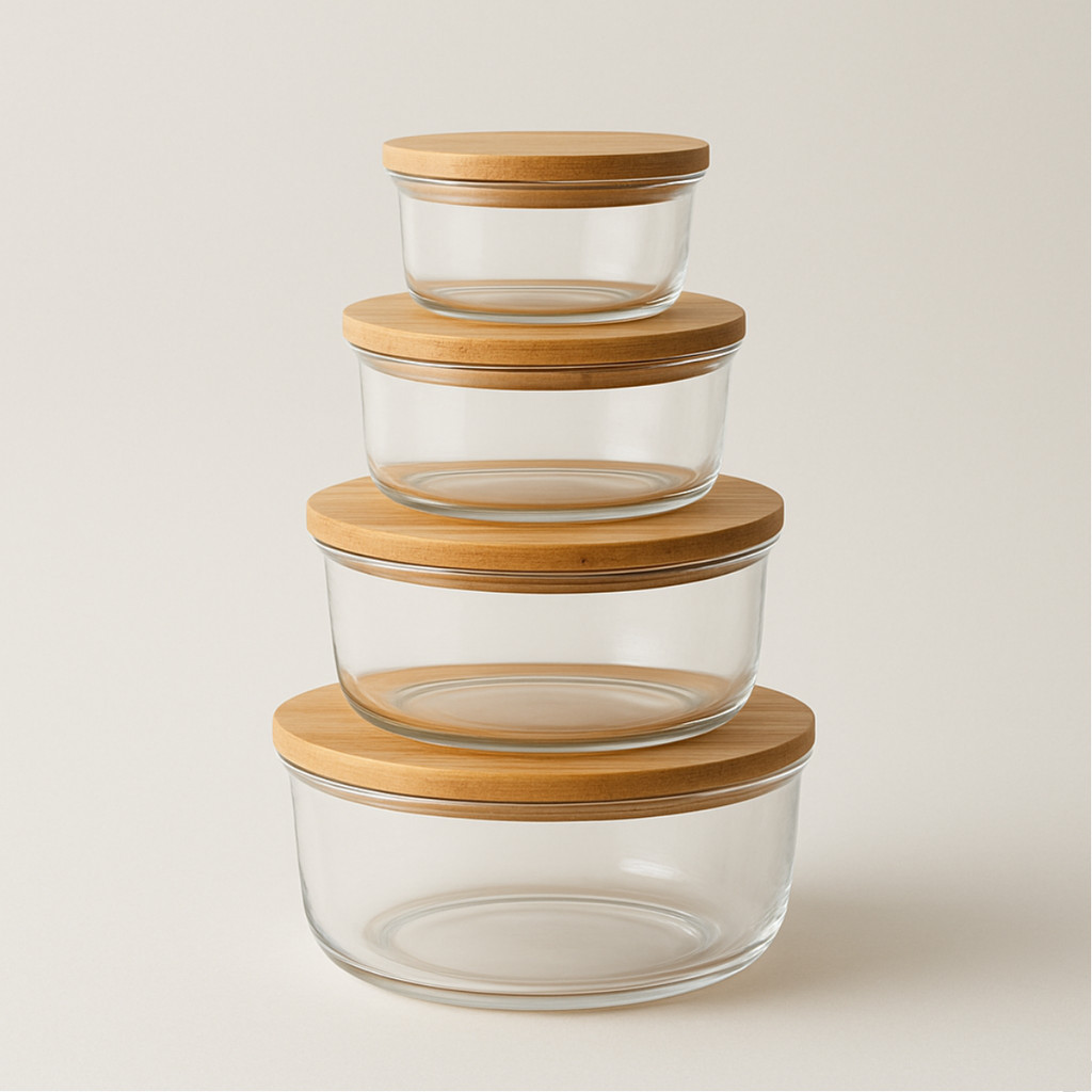 Kit 4 Pote Hermetico De Vidro Tampa De Bambu Tigela Marmita Salada Jogo De Potes De Mantimentos