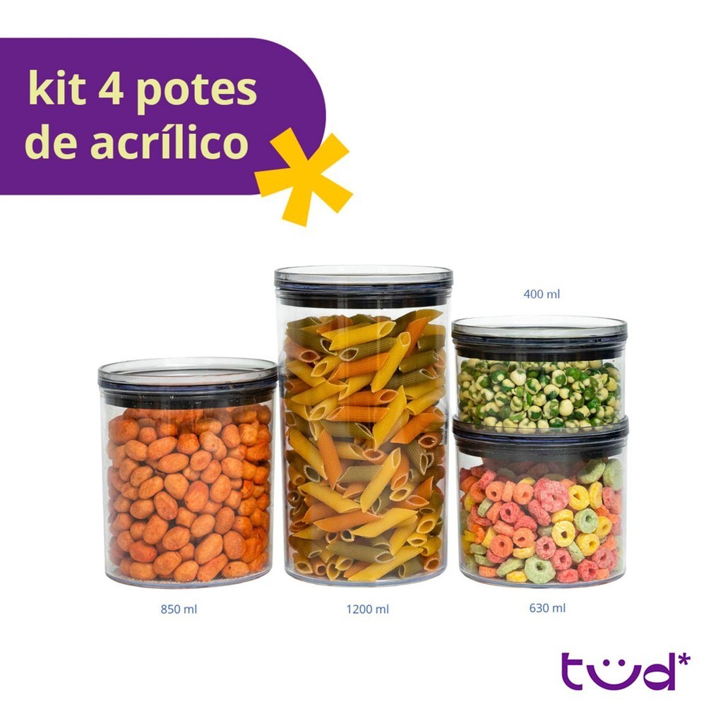 Kit 4 potes de acrílico com tampa herméticos redondos - Tud