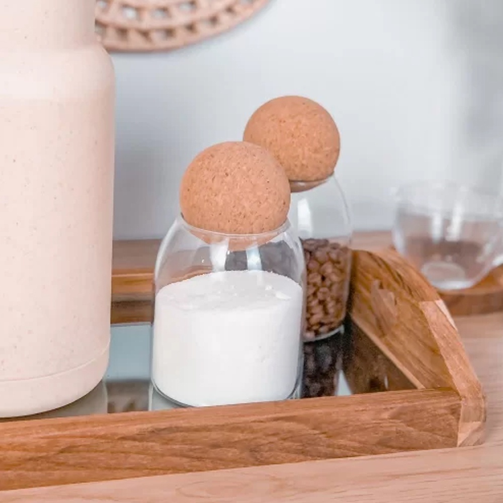 Descrição do Produto Kit 4 Potes De Vidro Com Tampa Esfera Rolha Clean 510+800 Ml - Lyor Mais informações Marca: LYOR Descrição completa Kit com 4 Potes De Vidro Rolha Cortiça Borossilicato Tampa Esfera 02x Capacidade: 800 Ml Altura: 15,0cm Comprimento: 6,3cm Largura : 9cm 02x Capacidade: 500ML Litros Altura: 10,2cm Comprimento: 6,3cm Largura : 9cm Armazenar bem os alimentos é fundamental para que eles não percam textura, sabor e, principalmente para garantir a saúde da sua família. O pote de vidro transparente é super moderno, perfeito para mantê-los à vista. Conta com tampa com formato de bola de cortiça que garante a vedação do recipiente, mantendo os alimentos frescos por mais tempo. E ainda mantém todo o charme e elegância da cozinha ou copa. É ideal para organizar armários e aparadores, aproveitando melhor o seu espaço. Detalhes técnicos: Material: Vidro Borossilicato e cortiça Cor: \u2022 Pote: Transparente \u2022 Tampa: Cortiça (rolha) Formato da tampa: esfera em cortiça Cuidados: \u2022 Use esponja macia e sabão neutro. \u2022 Não limpe as peças com esponja áspera, palha de aço ou produtos abrasivos. \u2022 Para secar, utilize um pano seco e macio AGRADECEMOS A SUA VISITA!