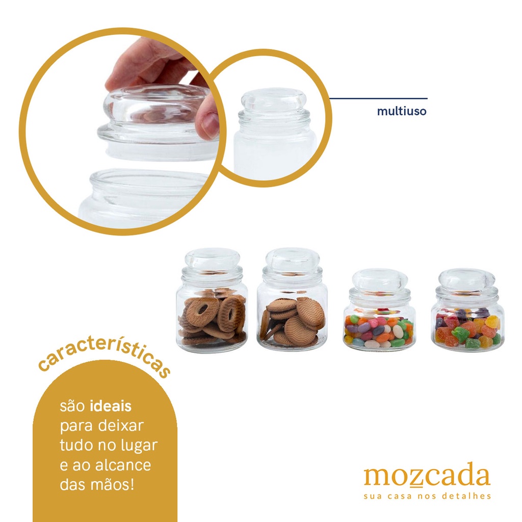 Kit 4 potes de vidro com tampa herméticos redondos 350ml e 500ml - Mozcada