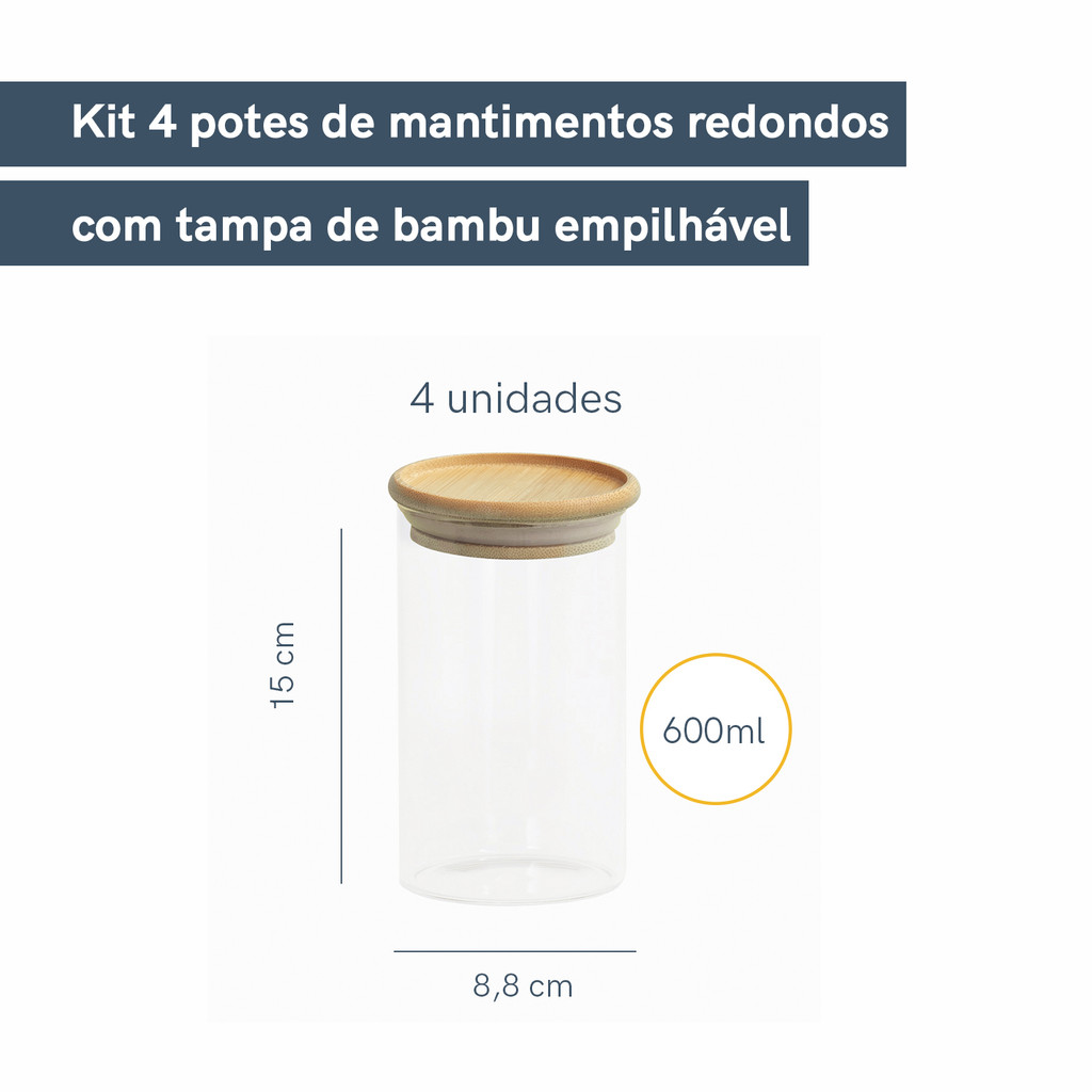 Kit 4 Potes de Vidro Empilhável Hermético Tampa Bambu 600ml Oikos