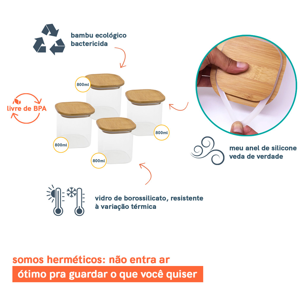 Kit 4 Potes De Vidro P/ Mantimentos 800ml C/ Tampa Bambu