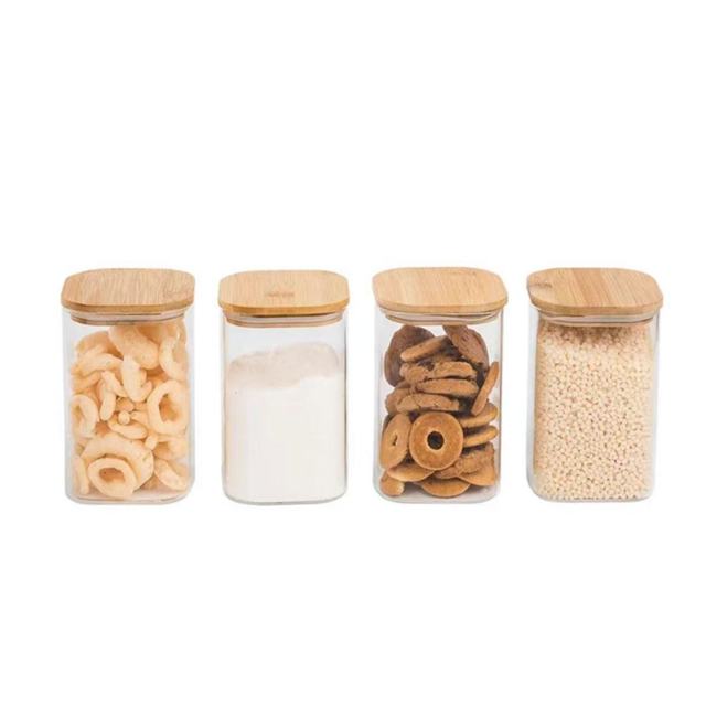 Kit 4 potes de vidro ( quadrado )com tampa de bambu herméticos para mantimentos 300ml