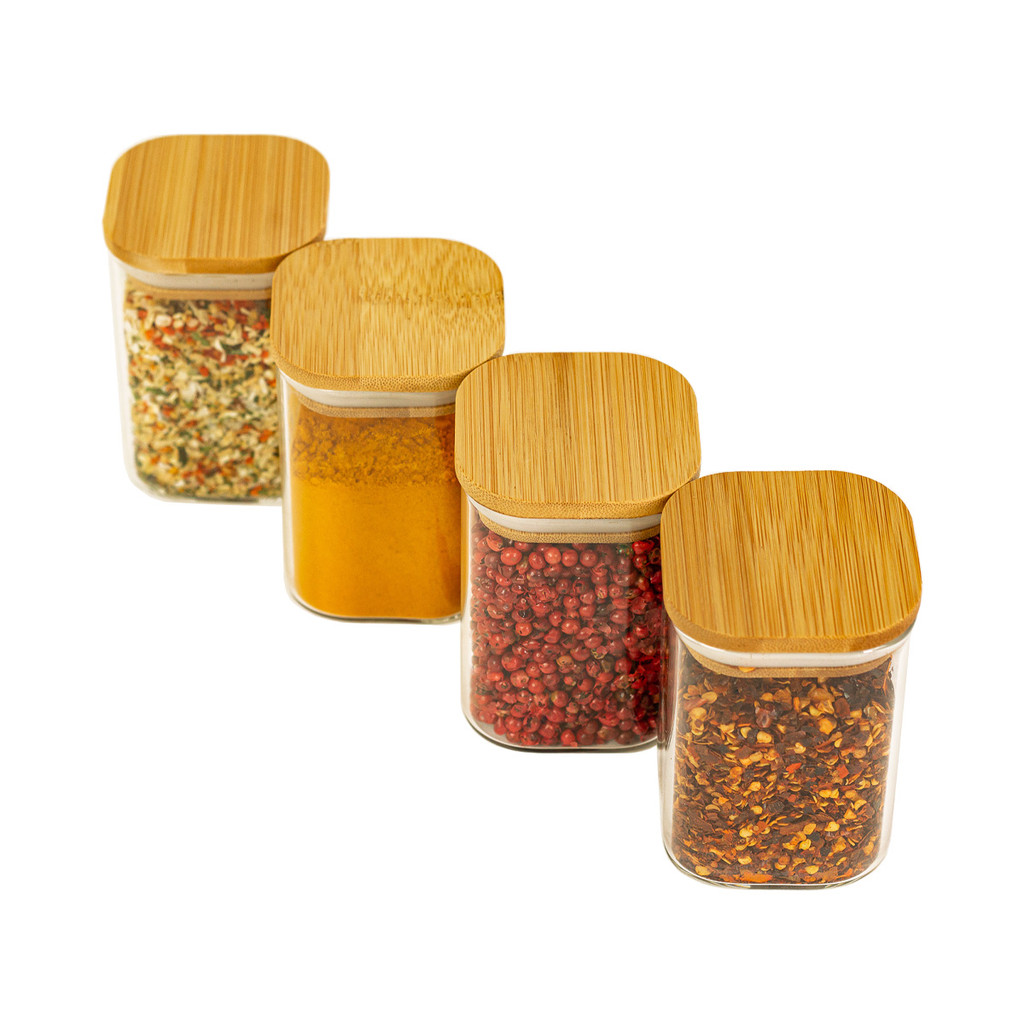 Kit 4 Potes de Vidro Tampa Bambu Quadrado Flat 200ml Oikos