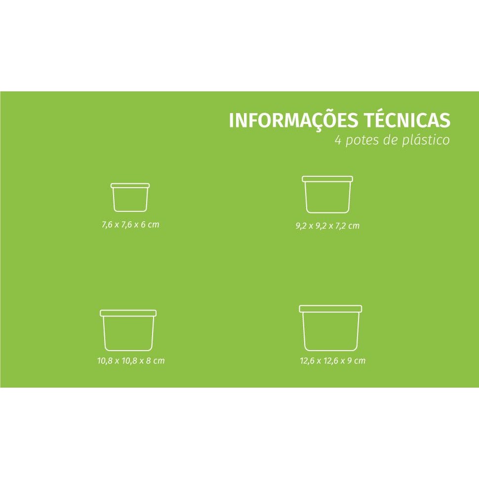 Kit 4 Potes Encaixáveis Quadrados Plástico Conect Plasútil Dimensao: (Comp x Larg x Alt): 12,8x12,8x9,0 cm - A linha CONECT é perfeita para manter seu armário ou gaveta de potes organizados. - As tampas e bases se encaixam perfeitamente, otimizando espaço: 4 potes ocupam o espaço de 1! - Fabricados em plástico polipropileno (PP). Atóxicos e livres de bisfenol-A (BPA FREE). - Podem ir ao freezer, micro-ondas e lava-louças. - Tampas possuem aba para facilitar a abertura. - Envio: tampas possuem cores diversas, podendo divergir da foto principal. - Composto por 4 potes: 140 ml, 270 ml, 470 ml e 760 ml..