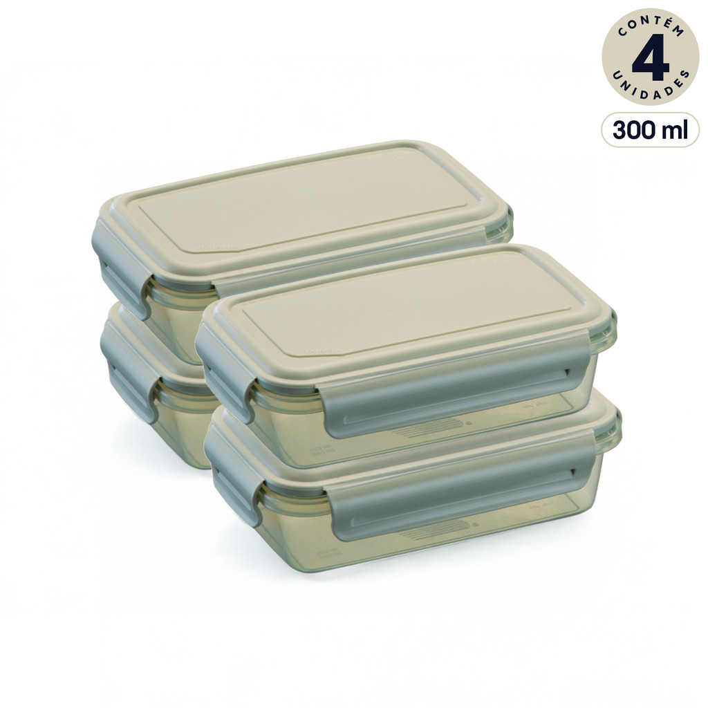 Kit 4 Potes Extra-pequenos Baixos Marmita SlimLock 300ml Plástico com Travas Translúcido Resistente