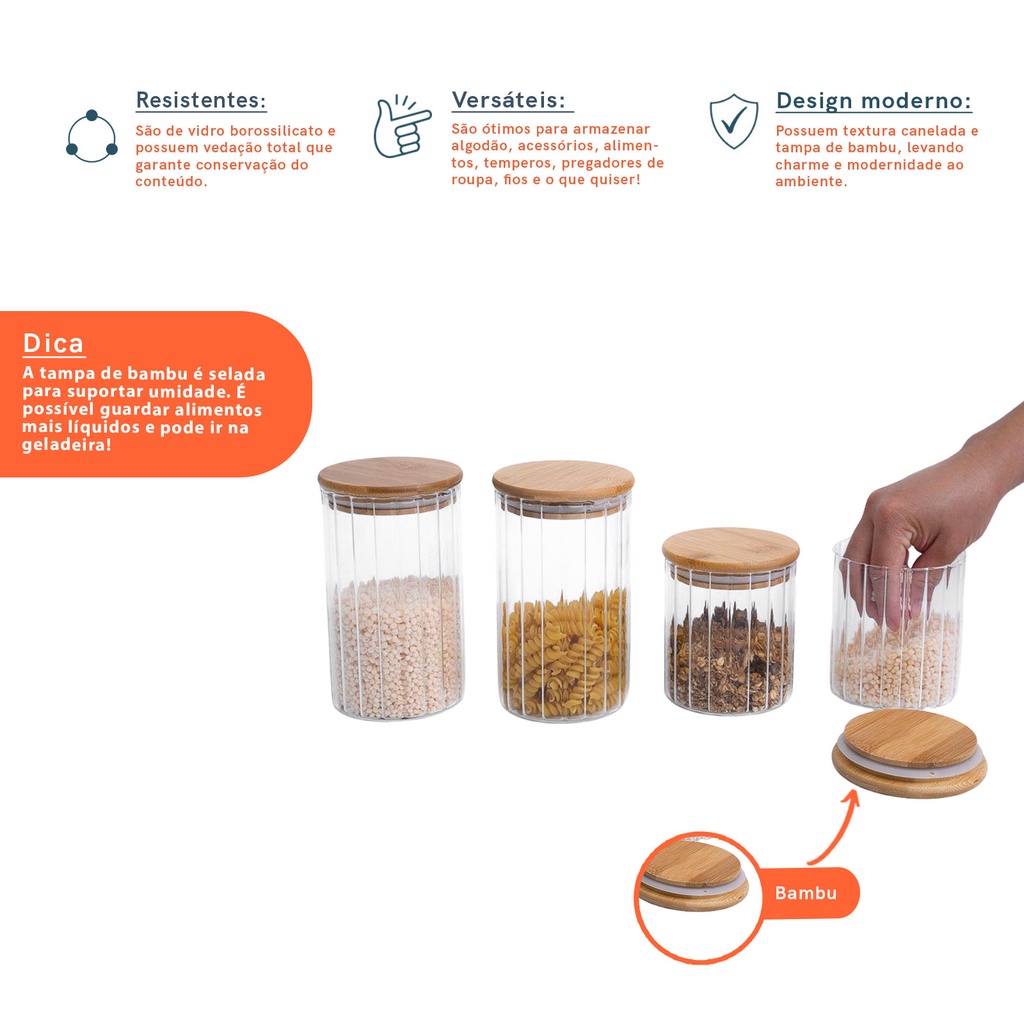 Kit 4 potes vidro herméticos para mantimentos canelado com tampa de bambu - Oikos