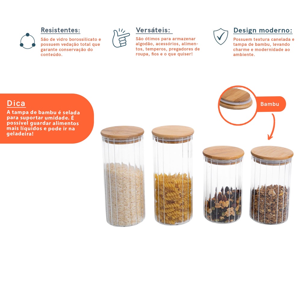 Kit 4 potes vidro herméticos para mantimentos canelado com tampa de bambu - Oikos