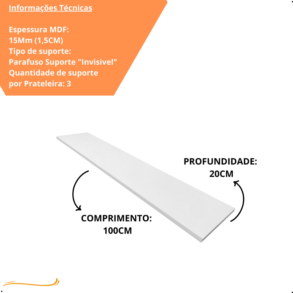 QTD DE PEÇAS: 4 COR: Branco TX MATERIAL: 100% Mdf DIMENSÕES COMPRIMENTO: 100 CM PROFUNDIDADE: 20 CM ALTURA(ESPESSURA):1,5CM(15mm) Acompanha suporte: Sim Qtd de Suporte por peça: 3 Tipo Do Suporte: Suporte Invisível