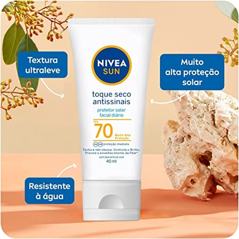 Protetor Solar Nivea Sun FPS70 Toque Seco Antissinais 40Ml.Nivea Sun Facial Toque Seco Antissinais é um protetor solar facial para uso diário. Com exclusiva fórmula de textura leve, rápida absorção e toque seco, controla o brilho e deixa sua pele macia e radiante. Além de oferecer alta proteção imediata uva/uvb contra os efeitos do sol, previne o envelhecimento precoce da pele causado pela exposição solar/radiação. Perfeito para usar até mesmo antes da maquiagem.- Alta proteção contra raios uva/uvb;- Oil free;- Textura ultra leve;- Toque seco;- Reduz e controla o brilho;- Resistente à água;- Previne o envelhecimento da pele causado pela exposição solar;