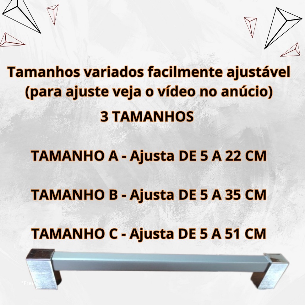 kit 4 unidades Os puxadores para móveis são itens fundamentais do mobiliário de qualquer ambiente, sejam salas, cozinhas, banheiros ou até mesmo escritórios. É importante que um puxador, além de bonito, seja resistente e durável, pois, dessa forma, estará sempre influenciando de forma positiva no charme e na sofisticação do móvel e do local em que for instalado. Material: ABS Tamanho variado facilmente ajustável (para ajuste veja o vídeo) tamanho A - ajusta de 5cm a 22cm. tamanho B - ajusta de 5cm a 35cm. tamanho C - ajusta de 5cm a 51cm. Para mais informações entrar em contato