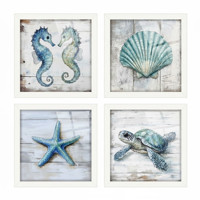 Kit 4 quadros 18x18 cm mar, praia, banheiro, lavabo, tartaruga, moldura e vidro