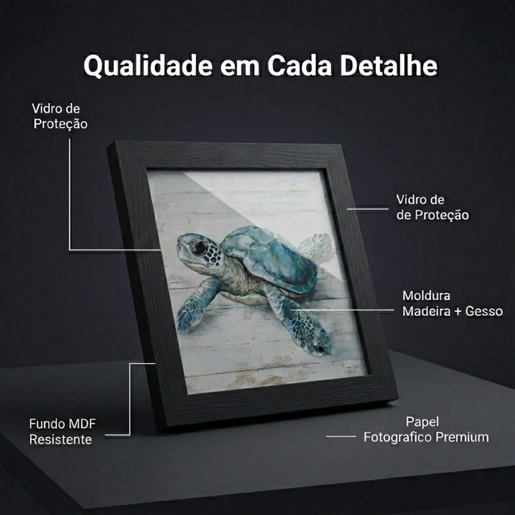 Kit 4 Quadros 18x18 cm Cavalos-Marinhos Concha Estrela-do-Mar Tartaruga Turquesa Moldura Vidro Leve a magia do fundo do mar para a sua decoração com este encantador conjunto de 4 quadros decorativos Smart Deco. Cada peça, no tamanho de 18x18 cm, traz ilustrações que simulam pintura em madeira, retratando um casal de cavalos-marinhos, uma concha, uma estrela-do-mar e uma tartaruga em tons deslumbrantes de turquesa. Essas obras exclusivas são perfeitas para quem deseja trazer serenidade, beleza e um toque de natureza marinha para a sala, quarto, banheiro, varanda ou até mesmo escritório. Especificações técnicas: Marca: Smart Deco Dimensões: 18x18 cm cada quadro Moldura: madeira de reflorestamento de alta qualidade Proteção: vidro transparente Fundo: MDF resistente e durável Impressão: papel fotográfico brilhante de alta definição Tipo de painel: quadríptico (4 peças) Tema: cavalos-marinhos, concha, estrela-do-mar e tartaruga em tons turquesa Penduradores: móveis tipo triângulo já instalados (necessita de pregos ou parafusos para fixação – não inclusos) Benefícios do produto: Decoração temática marítima com visual rústico e sofisticado. Ideal para ambientes que pedem tranquilidade e frescor. Moldura em madeira + vidro protetor garantem durabilidade. Impressão de alta definição com cores vivas e nítidas. Fácil instalação com penduradores móveis. Itens inclusos: 4 quadros decorativos 18x18 cm com moldura em madeira Vidro protetor Fundo em MDF Penduradores móveis já instalados Garantia: 30 dias contra defeitos de fabricação. Produtos enviados em embalagem reforçada, com suporte para trocas ou devoluções simples e rápidas. Palavras-chave: kit 4 quadros decorativos, quadros marinhos, quadros cavalos-marinhos, quadros conchas turquesa, quadríptico oceano, quadros Smart Deco, quadros praia banheiro lavabo, presente Dia das Mães, presente Dia dos Namorados, presente Natal, presente aniversário, presente Amigo Secreto.