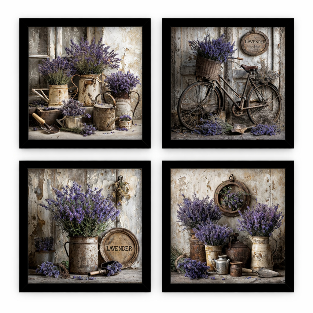 Kit 4 Quadros 30X30 Sala Varanda Vaso Flor Rústico Lavanda Carvalho