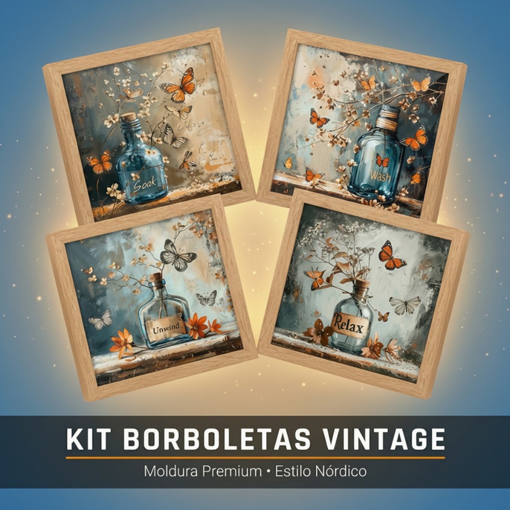 Quadros decorativos banheiro 18x18 com vidro, garrafas, flores e borboletas, perfeitos para lavabo e toalete. Transforme seu banheiro em um espaço elegante e relaxante com este kit de quadros 18x18, trazendo charme, cores vibrantes e detalhes inspiradores que destacam flores e borboletas em garrafas azuis. Palavras sutis como “SOAK”, “WASH”, “UNWIND” e “RELAX” reforçam a sensação de autocuidado e momentos de relaxamento. Produzidos com impressão fotográfica brilhante de alta qualidade, moldura em madeira de reflorestamento com vidro frontal e fundo em MDF resistente, garantindo durabilidade, proteção e acabamento refinado. Disponível em três cores de moldura: preto, branco e carvalho. Perfeito para banheiro, lavabo, toalete ou qualquer espaço que precise de elegância, calma e estilo. Também é uma excelente opção de presente para quem aprecia decoração sofisticada e relaxante. Informações técnicas: Tema: garrafas azuis com flores e borboletas Tamanho: 18x18 cm cada quadro Impressão: fotográfica brilhante Papel: fotográfico Moldura: madeira de reflorestamento Cores da moldura: preto, branco ou carvalho Proteção: vidro frontal Fundo: MDF resistente Instalação: pendurador móvel incluso Palavras-chave: quadros decorativos banheiro, quadros 18x18, quadros com vidro, quadros para lavabo, decoração banheiro, quadros garrafas flores, quadros borboletas, moldura madeira, quadros autocuidado, decoração relaxante