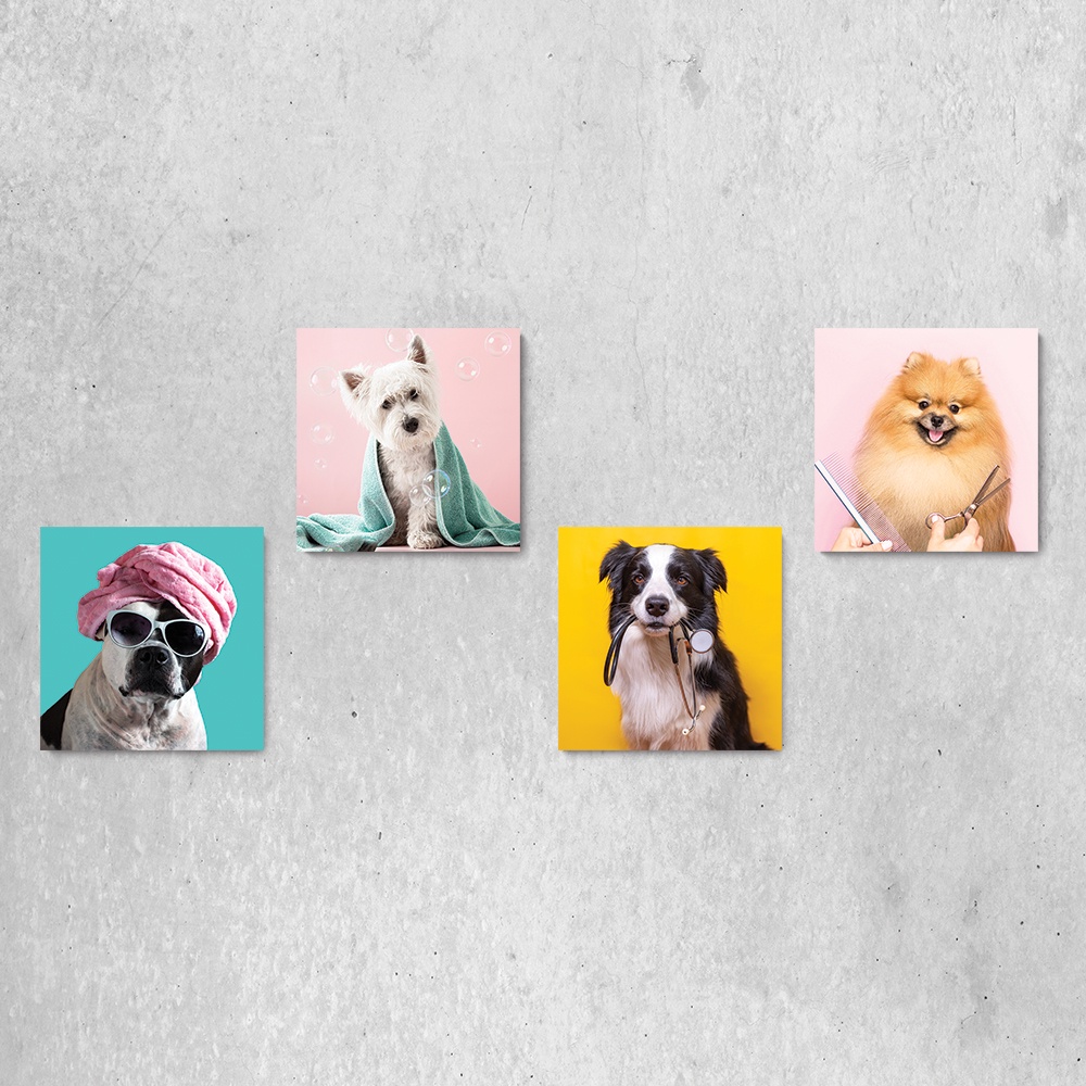 Kit 4 Quadros Decorativos Pet Shop Veterinário Cachorros Gatos Placas - 0008ktpl4 - As Placas Decorativas da Letto Adesivos ficam bem em todos os ambientes, na sala, no quarto, na cozinha, na varanda e até no cantinho do churrasco, dão um toque de qualidade na decoração do ambiente, produzidos em adesivo fosco aplicado em MDF de 3mm, e enviados com fita dupla face, prontinhos para colocar no ambiente, sem a necessidade de furos ou sujeiras. Medidas: 4 Placas de 20x20cm cada Material: - Quadros Decorativos produzido em MDF (os quadros não possuem moldura, são prontos para colar com fita dupla face) - São feitos em adesivos fosco e impressos em alta qualidade. - Aplicado em MDF com espessura de 3mm - Não é necessário furar a parede para instalação, pois, enviamos fitas 3M com grande poder adesivo para facilitar a instalação. - Embalados por nós com cuidado e carinho para chegar até você como se entregássemos um pedacinho de nós em suas mãos. - Embalagem reforçada feita especificamente para acomodar seu kit de placas para evitar danos em seu produto. - Limpeza: Limpar com pano úmido e em seguida secar com um pano seco - Cuidados: Não utilizar produtos químicos ou abrasivos