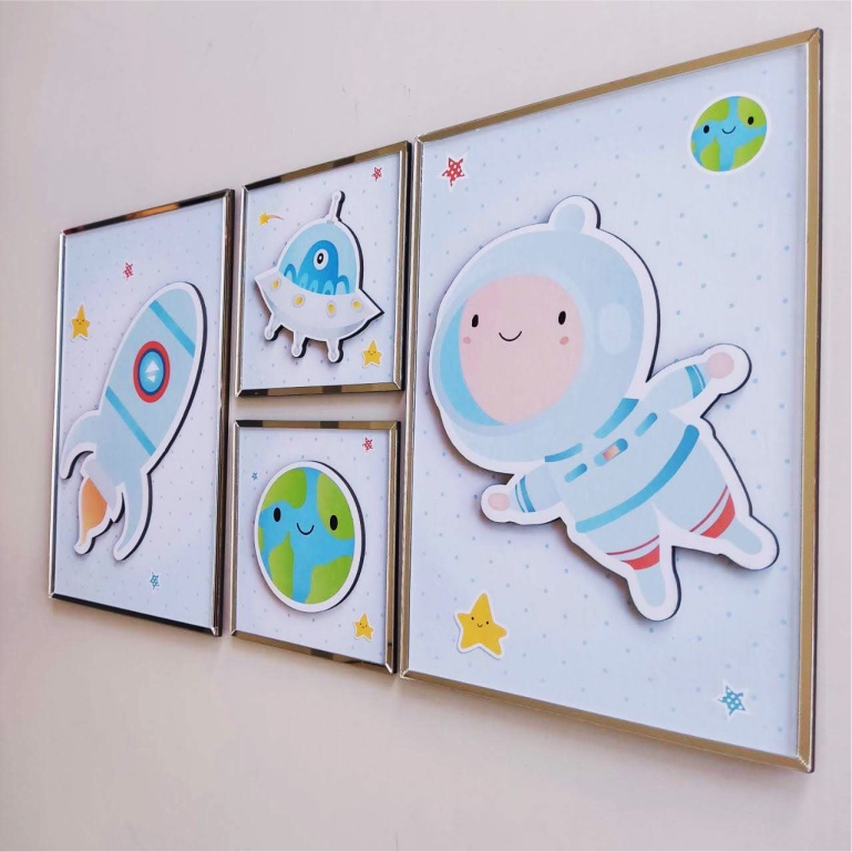 Kit 4 Quadros Decorativos Placas - Espaço - Astronauta - Nave - Infantil Bebê Quarto Menino Menina