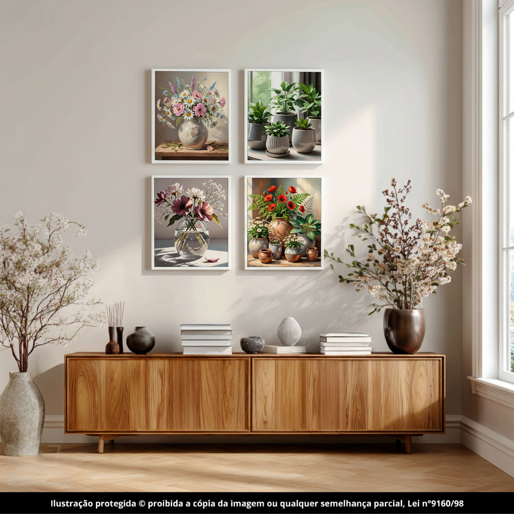 Kit 4 Quadros Decorativos Vasos de Flores Floral Conceitual Sala Quarto Cozinha Banheiro MDF