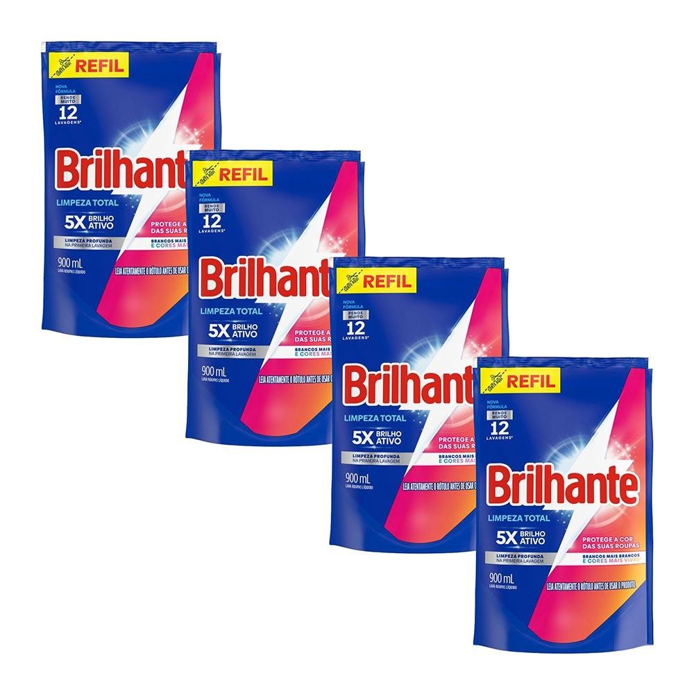 Kit 4 Refil Lava Roupas Líquido Brilhante Roupas Brancas e Coloridas Limpeza Total 900ml