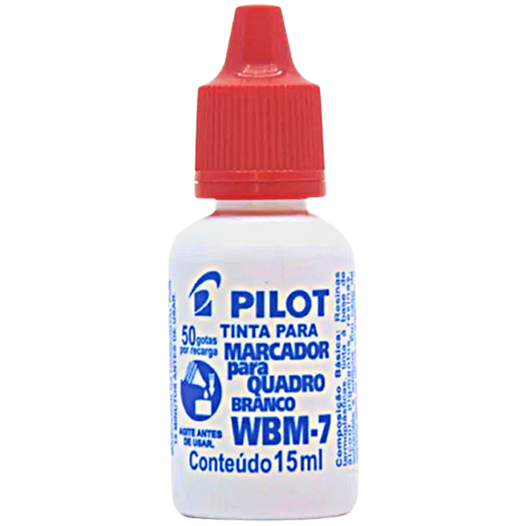 KIT 4 REFIL DE TINTA 15ML PARA MARCADORES DE QUADRO BRANCO WBM 7 - PILOTO Pedidos feitos até às 12:00 horas (de segunda à sexta) são despachados no mesmo dia!!!DESCRIÇÃO:• Quantidade: 15ml.• 50 gotas por recarga de uma forma simples e prática.• Pingue algumas gotas da tinta, e o marcador já está pronto para o uso.• Fácil remoção e secagem rápida.• Produto atóxico.CORES:• PRETO.• AZUL.• VERMELHO.