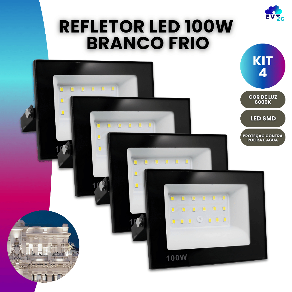 Kit 4 Refletor Led 100w Luz Holofote Bivolt Prova D'água Frio 110v/220v Externo