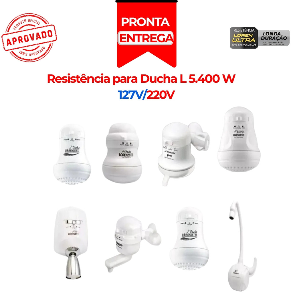 Resistência para chuveiro Resistência Tipo Lorenzetti, 3 Temperaturas (Morno/Frio/Quente) Estas resistências, são tais como as originais dos aparelhos de aquecimento de água duchas, chuveiros, torneiras e aquecedores da marca Lorenzetti de 5400 Watts. Elas são feitas com arame de liga de aço e cobre. São duráveis, seguras e econômicas, trazendo conforto na hora da utilização. Informações e Especificações Técnicas: * Ref 2134 220V VERÃO..................3,600W INVERNO..............5.400W - RELAÇÃO DE MODELOS DE CHUVEIROS E TORNEIRAS COMPATÍVEIS Maxi Ducha / Nova Maxi Ducha Maxi Banho Bello Banho / Bella Ducha Big Banho Relax / Relax Luxo Jet Set Torneira Clean / Torneira T-43 Torneira Versátil / Maxi Torneira.