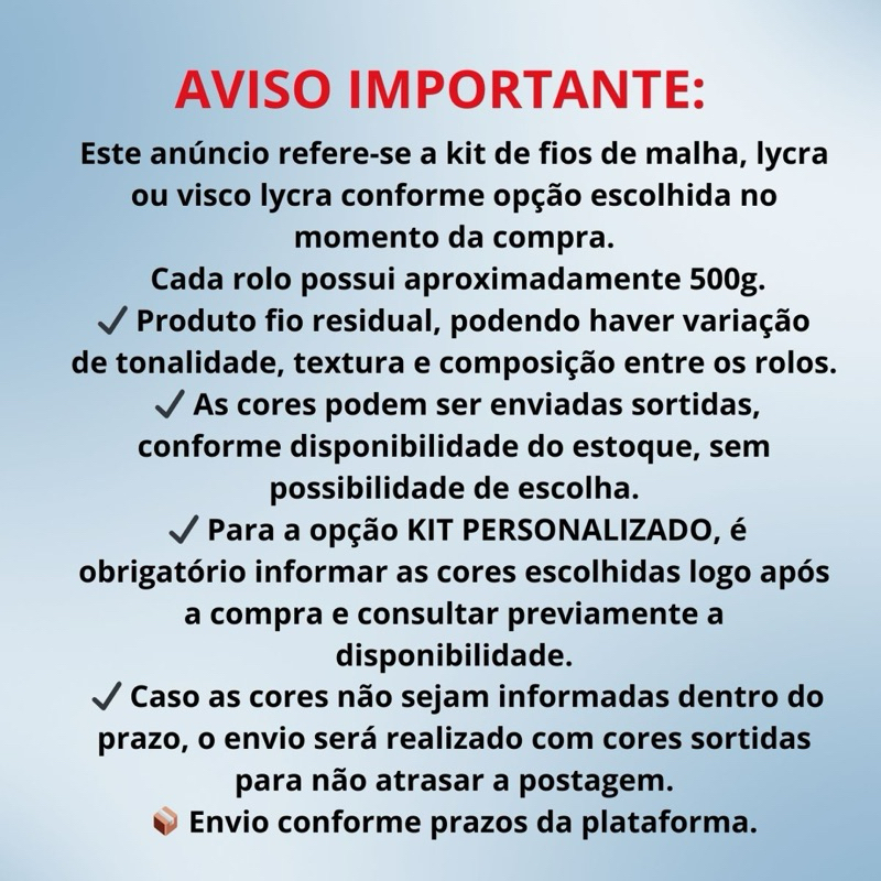 Kit com 4 rolos de fio de malha residual, cada um com cerca de 500g, ideal para projetos médios e grandes. 📌 Características: • Quantidade: 4 rolos • Peso: 500g por rolo • Fio resistente e versátil • Uso: tapetes, jogos de banheiro, cestos, bolsas e decoração • Cores sortidas ou personalizadas • A opção de cores sortidas NÃO são as mesmas da foto, a foto é meramente ilustrativa. • Para cores personalizadas, informe após a compra • Consulte disponibilidade antes Produto econômico, sustentável e de excelente qualidade.