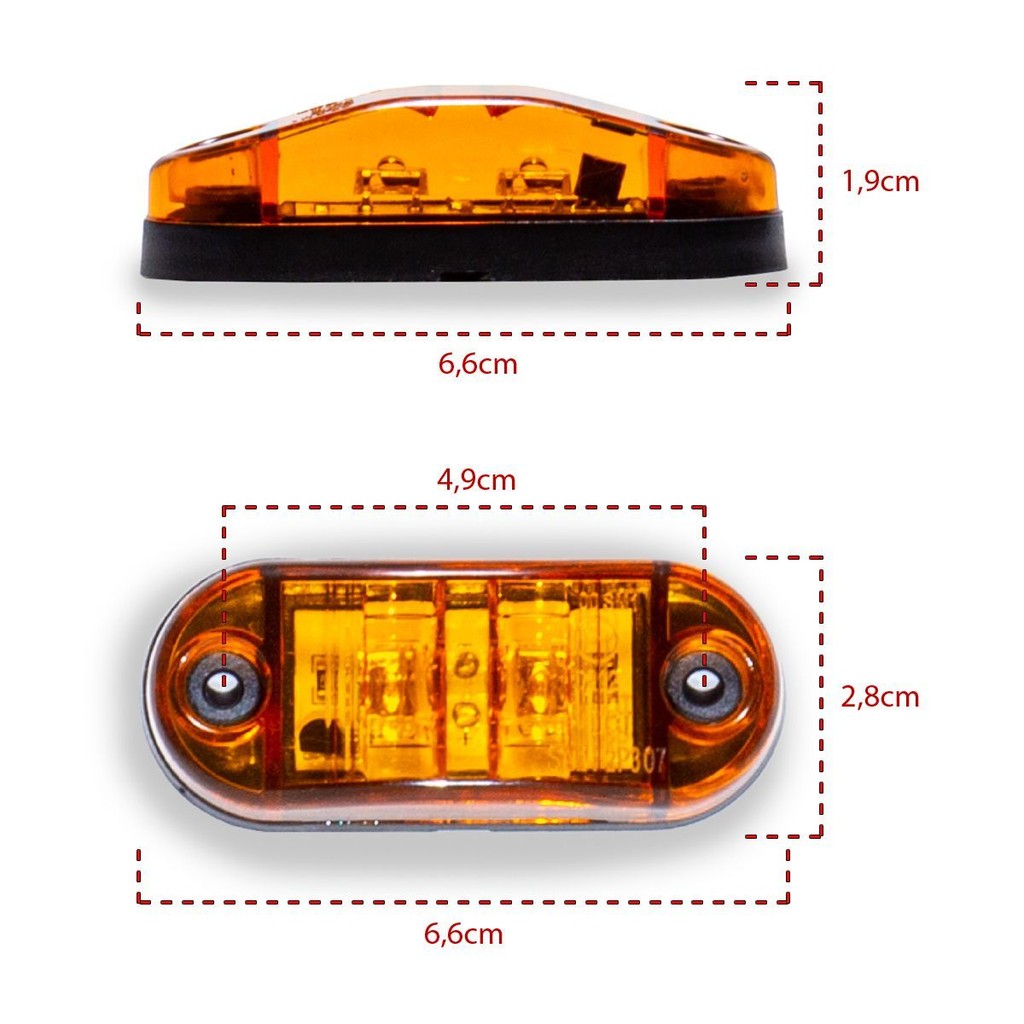 LANTERNA DELIMITADORA 2 LEDs BIVOLT 12V 24V CORES DISPONÍVEIS • Ambar • Azul • Branca • Verde • Vermelha OBS: Escolha a cor, antes de clicar em comprar ! CARACTERÍSTICAS • Dimensões do produto LxAxC: 6,6x1,9x2,8cm • Comprimento do chicote: 24cm • Distância entre furos para instalação: 4,9cm • Bivolt • Alto brilho • Alta durabilidade • Resistente a água • Distribuição uniforme da iluminação • Fácil de adaptar • Baixo consumo de energia • Aplicação: Caminhão baú, trailer, barcos, carretas, ônibus, vans etc. Tudo o que você sempre buscou em benefícios, vai encontrar no LANTERNA DELIMITADORA 2 LEDs BIVOLT! A LANTERNA DELIMITADORA 2 LEDs é feita de um material de alta qualidade que oferece maior durabilidade, tamanho compacto e acabamento impecável. Além de ser resistente a vibrações e calor, possui grau de proteção IP 65 resistente a água. Usada na lateral dianteira e parte superior do baú, tendo como principal função indicar as dimensões laterais dos veículos, tais como caminhões baú, trailer, barcos, carretas e ônibus facilitando a visibilidade à noite. A sua Lente é em PMMA anti-UV, com design ótico avançado, e a base é feita de ABS anti-UV. Seu circuito eletrônico com proteção de ligação invertido evitará que seus LEDs queimem. O produto não acompanha suporte. A LANTERNA DELIMITADORA 2 LEDs BIVOLT oferece alta qualidade, durabilidade, segurança, resistência e excelente luminosidade! ESQUEMA DE LIGAÇÃO ELÉTRICA • Fio laranja = positivo. • Fio preto = negativo (GND, TERRA). ESPECIFICAÇÕES • Encaixe: Universal • Tensão: 12 a 24V • Equivalência: 3W • Lente: PMMA anti-UV • Tipo de LED: SMD • Linha: Standart • Grau de proteção de água: IP65 • Fluxo Luminoso: 5 lúmens ITENS INCLUSOS • 4 Lanterna Delimitadora Lateral 2 Leds Bivolt