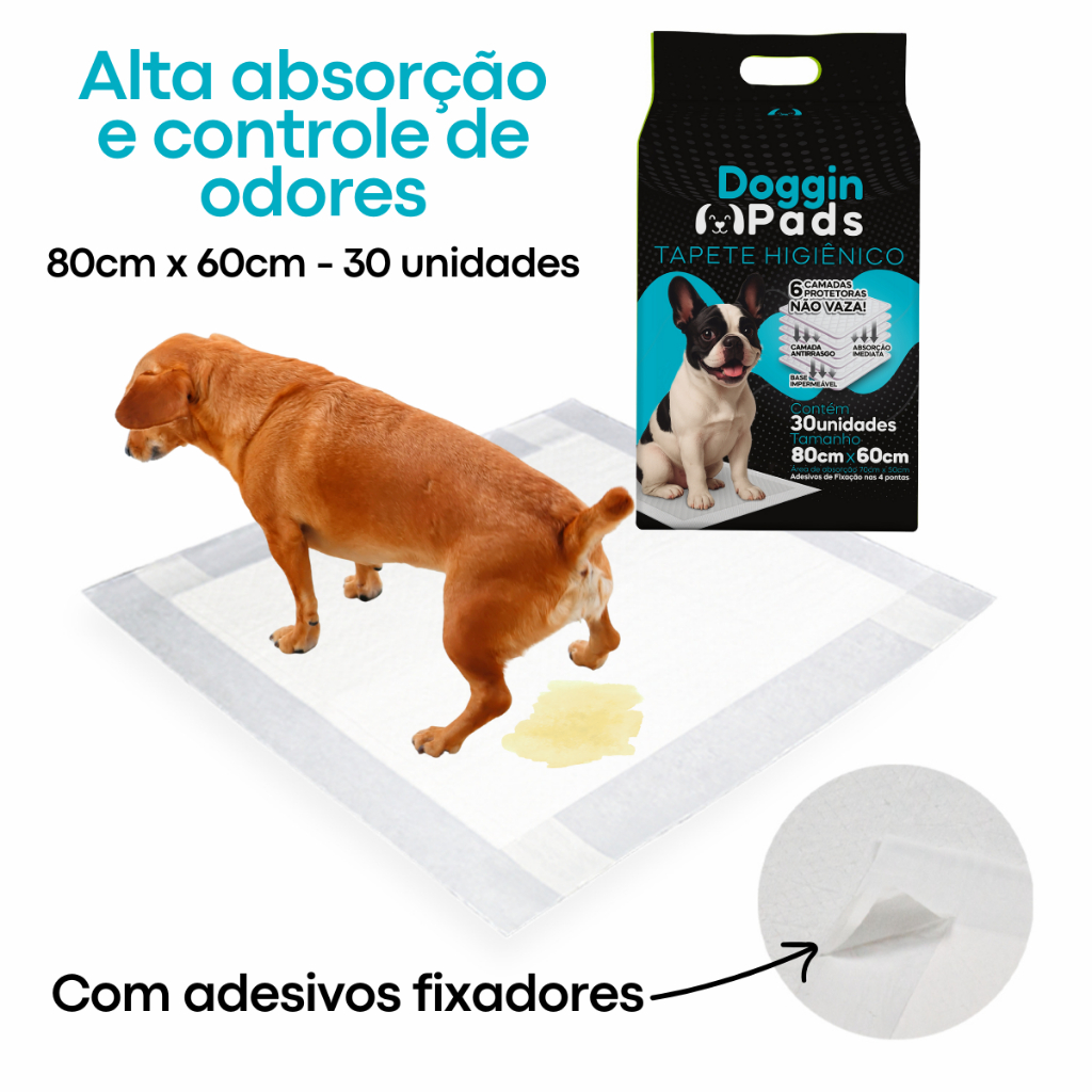 Tapete Higiênico de alta absorção para o seu cachorro! Cachorros limpos e cheirosos são grandes desejos de todos os amantes de animais, não é mesmo? Principalmente em relação a urina, não queremos mau cheiro, odor e aromas desagradáveis dentro de casa, certo? Por isso, precisamos fazer a escolha certa para um bom tapete higiênico!! Às vezes ficamos perdidos, entre tantas opções, sobre qual tapete higiênico escolher para uma boa higiene dos nossos cachorros. O Tapete Higiênico para Cachorro Doggin Pads traz: Limpeza, Higiene e Absorção total, que vai deixar a sua casa sem mau cheiro. Benefícios Do Tapete Higiênico para Cachorro Doggin Pads: - Atrativo canino para o cachorro. - Possui barreira antivazamento. - Adesivos de Fixação. - Absorção Total da Urina. - Tamanho ideal para o cachorro. - Proporciona Higiene completa do seu lar. - Fórmula Neutra que não agride o animal. Informações Técnicas: - Produto: Tapete Higiênico para Cachorro Doggin Pads 80 x 60 cm – 4 pacotes de 30 unidades - Marca: Doggin Pads - Tipo: Tapete Higiênico para Cães - Animal: Cachorro - Porte: Todos os portes. - Raça Específica: Não - Sexo Específico: Não - Itens Inclusos: 120 Unidades de Tapete Higiênico para Cachorro Doggin Pads 80 x 60 cm - Embalagem: 30 unidades - Composição: Filme de polietileno, tecido não-tecido, celulose, papel, polímero super absorvente, atrativo. Modo de usar: 1. Tire o tapete do pacote e estique-o totalmente. 2. Leve a um local da sua preferência aonde o cachorro já esteja acostumado a urinar. 3. Com o tapete esticado, use os adesivos para fixar bem o tapete no chão. 4. Pronto! Agora o tapete está pronto para uso. Caso o cachorro não acostume, você pode incentivá-lo com atrativos caninos. Precauções: Descartar o tapete higiênico após uso contínuo. Tomar cuidado com o animal se ingerir o tapete. Evitar colocar o tapete perto de alimentos do animal. PERGUNTAS FREQUENTES POSSO USAR O TAPETE HIGIÊNICO PARA CÃES FILHOTES? Sim!! O tapete higiênico da Doggin Pads é indicado para cães filhotes à adultos. O PRODUTO PODE SER USADO POR CÃES ALÉRGICOS? Sim! O produto não agride o seu animal. O Tapete Higiênico Doggin Pads pode ser usado para gatos? Não! O tapete higiênico da Doggin Pads é indicado apenas para cachorros filhotes, adultos e sêniors.