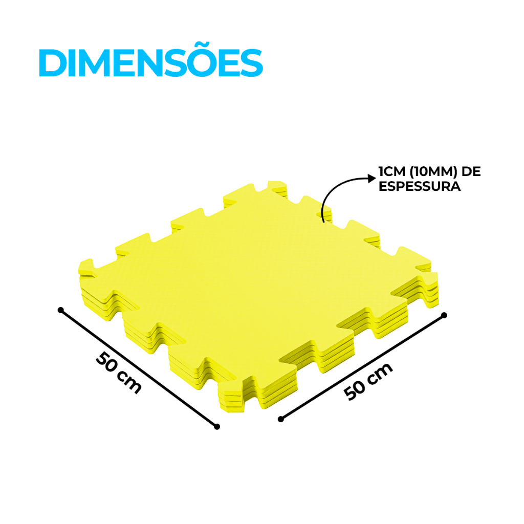 KIT COM 4 TATAMES 50x50 Crie um espaço seguro, confortável e funcional com nosso kit de 4 tatames EVA. Este produto possui pequenas imperfeições de fábrica, como marcas, riscos ou leves diferenças de corte, mas que não comprometem o uso. As cores do kit são enviadas de forma aleatória, conforme disponibilidade em estoque. Cada placa acompanha bordas de acabamento, garantindo melhor encaixe e um visual mais uniforme. SOBRE AS BORDAS DE ACABAMENTO INCLUSAS O que são: Peças que se encaixam nas laterais, cobrindo os “dentes” do tatame e criando uma finalização reta e uniforme. Quantidade: Você recebe 3 bordas por placa (sendo 1 pequena e 2 grandes). Vantagens: Mais segurança, acabamento bonito e ajuda a evitar tropeços. PRINCIPAIS BENEFÍCIOS DO PRODUTO Segurança: EVA atóxico, antiderrapante e com espessura de 1cm para absorção de impactos. Conforto térmico: Isola do frio do piso, deixando o ambiente mais aconchegante. Praticidade: Fácil de montar, desmontar e limpar. Versatilidade: Ideal para áreas infantis, academias, espaços de treino ou lazer. FICHA TÉCNICA Material: EVA (Etil Vinil Acetato) Dimensões por placa: 50cm x 50cm Espessura: 10mm (1cm) Acessórios inclusos: 3 bordas de acabamento por placa (1 pequena e 2 grandes) Conteúdo do kit: 4 placas de tatame Observação: Produto pode apresentar pequenas imperfeições visuais, mas continua totalmente funcional. As cores são enviadas de forma sortida, não sendo possível escolher.