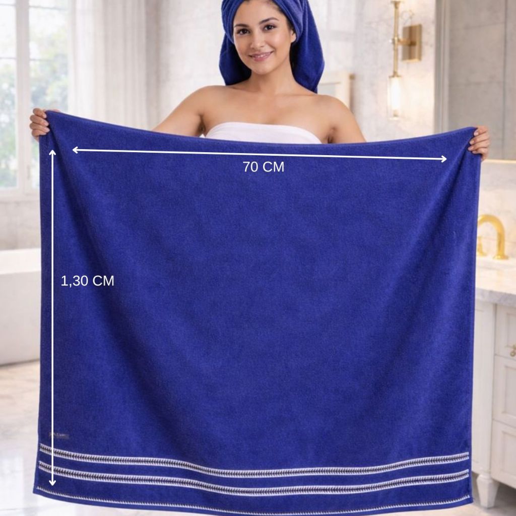 🛁 Kit 4 Toalhas de Banho Grandes – Estilo e Praticidade para o seu Dia a Dia! Transforme o visual do seu banheiro com este kit exclusivo de toalhas que unem beleza, tamanho generoso e excelente custo-benefício. Com 1,30m de comprimento, elas garantem uma ótima cobertura e conforto após o banho. Por que escolher este Kit? Tamanho Gigante: Medindo 130cm x 70cm, ideal para quem busca uma toalha que envolva o corpo de verdade. Beleza nos Detalhes: Possui uma barra decorativa com bordado geométrico moderno que traz sofisticação para o ambiente. Composição Premium: Confeccionada em Algodão (exceto efeito decorativo), garantindo um toque macio e natural na pele. Secagem Rápida: Por não serem excessivamente grossas, elas são leves, fáceis de lavar e secam muito mais rápido que as toalhas convencionais — perfeitas para o dia a dia corrido ou apartamentos com pouca ventilação. O que você recebe: 04 Toalhas de Banho Medidas: 1,30m x 70cm Material: Algodão (exceto detalhes decorativos) Dica de Conservação: Para manter a maciez e a absorção, recomendamos não usar excesso de amaciante nas primeiras lavagens. Estoque disponível para envio imediato! Garanta seu kit e renove seu enxoval com estilo. 1. A toalha é de algodão? Sim! O corpo da toalha é confeccionado em algodão, garantindo um toque natural e confortável. Apenas o detalhe decorativo da barra possui material sintético para manter o brilho e o desenho. 2. Ela é muito fina? Ela possui uma gramatura média, o que a torna leve e prática. A grande vantagem é que ela não fica pesada quando molhada e seca muito mais rápido no varal do que toalhas muito grossas, evitando mau cheiro. 3. Qual o tamanho exato? Cada toalha mede aproximadamente 1,30m de comprimento por 70cm de largura. É um tamanho excelente que atende muito bem adultos. 4. O kit vem com cores sortidas ou posso escolher? sim , pode escolher na variação do produto 5. Ela solta muito fiapo? sem fiapos , melhores toalhas de qualidade. 6. Pode ser lavada na máquina? Sim, pode ser lavada na máquina de lavar normalmente. Recomendamos ciclo delicado para preservar o bordado da barra por mais tempo.