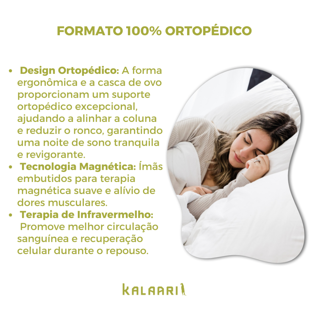 KIT 4 Travesseiros MAGNÉTICO ALTO Terapeutico com Infravermelho Espuma Massageador Anti Ronco Ortopedico Anatomico BENEFÍCIOS DO PRODUTO KALAARI: - Os imãs reduzem dores de cabeça, enxaqueca, cansaço físico e mental; - Favorece o controle da pressão arterial, ajuda a prevenir doenças cardiovasculares; - Previne o envelhecimento precoce auto massageando a face e auxiliando no combate as rugas; - Reduz o ácido láctico; - Estimula a produção de vitamina D no organismo; - Combate a retenção de líquidos causadores de celulite; - Evita a fadiga e o cansaço muscular, dando uma sensação de conforto e relaxamento durante o sono; - Anti ácaro, anti bacteriano, antifúngico; - Apoio cervical e alinhamento da coluna e cabeça. ESPUMA PERFILADA - A espuma perfilada com formato ondulado estimula a circulação sanguínea e proporciona uma suave massagem conforme o movimento da cabeça no período do sono. COM ENCHIMENTO INFORMAÇÕES TÉCNICAS: Medidas Aproximadas: L 35 cm X A 15 cm X C 55 cm Modelo: Perfilado Magnético Material: Espuma D20 Soft Capa em fronha impermeável Garantias do produto: 30 dias da DENSIDADE Das Espumas Seguindo As Normas Da ABNT Contraindicação: Portadores de marca-passo e pessoas em tratamento de hemodiálise, se tiverem esses sintomas, consulte seu médico e escolha outras opções em nossa loja. PERGUNTAS FREQUENTES: -Qual a altura ideal para comprar um travesseiro? R: Altura mais indicada seria a medida do ombro até a cabeça -O travesseiro pode ser lavado? R: Aconselho usar capa protetora ou fronha para facilitar a higienização -Quais as contra Indicações? R: Não indicado para pessoas hipoalérgicas e que possuem marca-passo pois o campo magnético interfere no funcionamento do marca-passo e pode levar a uma parada do coração -Qual é o peso desse produto? E o tamanho? R: Entre 240 a 300 g. Altura 15 cm, Largura 35, Comprimento 55 cm -Qual o material da espuma? R: Espuma de poliuretano COM GARANTIA PRODUTO A PRONTA ENTREGA DESPACHAMOS O PRODUTO EM MENOS DE 24HRS ENVIO IMEDIATO ALTA QUALIDADE - ESPUMA POLIUTERANO