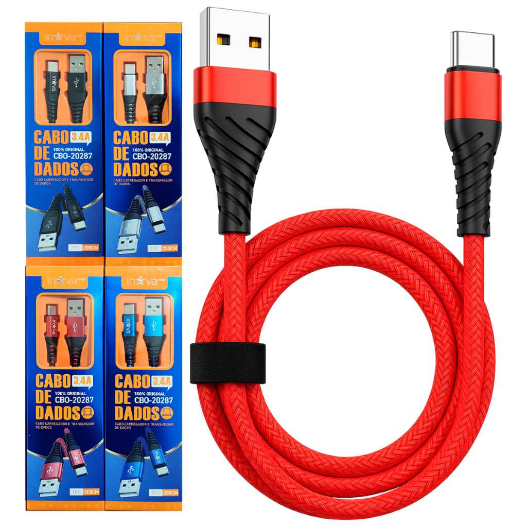 *KIT CONTENDO 4 UNIDADES* -------------------------------------------------------------------------------------------------------- Potência, resistência e compatibilidade em um só cabo. O Cabo Carregador Turbo Inova com conexão USB para Tipo C oferece carregamento rápido de 3.4A, ideal para quem busca desempenho e durabilidade no dia a dia. Revestido em nylon trançado, é resistente ao desgaste, não embaraça e possui reforço antiquebra para uso intenso. O que acompanha o produto: • 4x Cabos Inova USB para Tipo C – 2 metros (cores enviadas conforme disponibilidade) Destaques: • Carga rápida com potência de até 3.4A • Revestimento em nylon trançado: mais durabilidade e resistência • Reforço antiquebra: proteção nas extremidades contra rompimentos • Encaixe seguro e firme, sem danificar o conector do aparelho • Cores variadas enviadas de forma sortida conforme o estoque • Ideal para uso em casa, no carro ou no trabalho Especificações Técnicas: • Marca: Inova • Tipo: USB para Tipo C • Potência: 3.4A • Comprimento: 2 metros • Material: Nylon trançado • Reforço: Anti-quebra nas extremidades • Compatibilidade: Dispositivos com entrada USB-C (Android, iPhone 15 em diante, entre outros) Dúvidas Frequentes: • Funciona com iPhone 15? Sim, desde que o modelo utilize entrada USB-C. • Serve para transferência de dados? Sim, além do carregamento, também permite sincronização de arquivos. • As cores são escolhidas? As cores são enviadas sortidamente conforme a disponibilidade em estoque. • É compatível com carregadores turbo? Sim, o cabo suporta carregamento rápido com potência de até 3.4A. Garanta já o seu e tenha mais velocidade, segurança e durabilidade no carregamento dos seus dispositivos.
