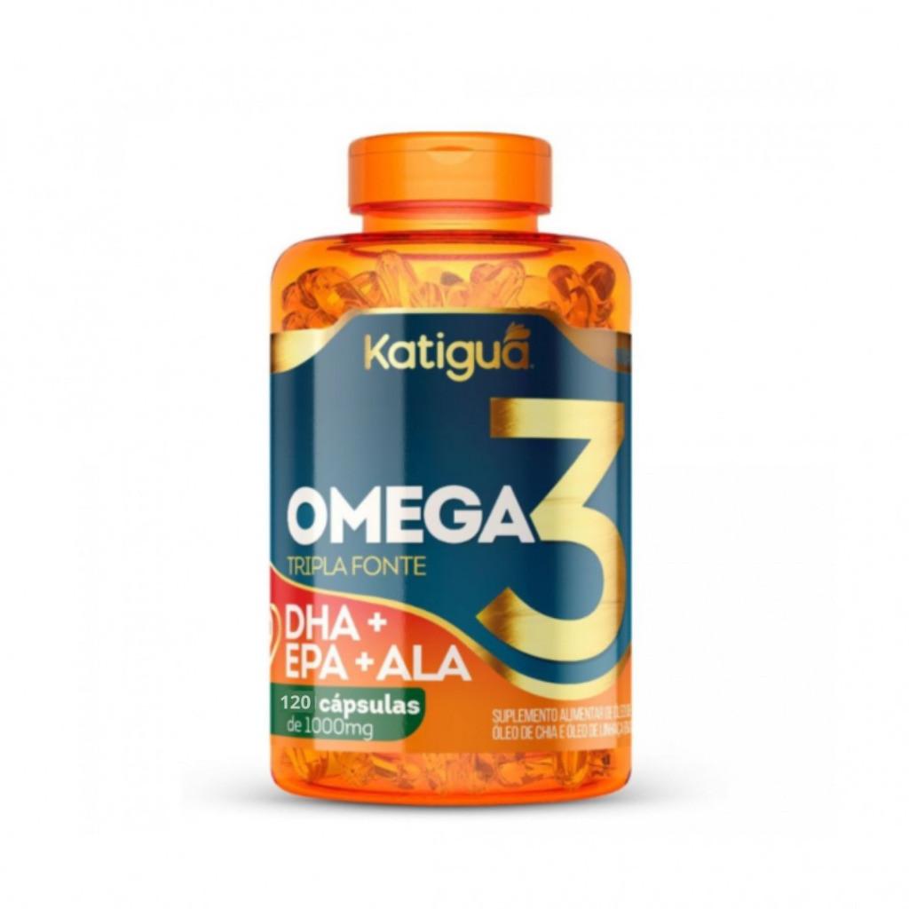 Kit 4 unidades: Ômega 3 Tripla Fonte Katiguá 120 cápsulas O Ômega 3 Tripla Fonte Katiguá 120 cápsulas é um suplemento alimentar que auxilia na pressão arterial e reduz inflamação, tem proteção cardiovascular e aumento do colesterol. Sua formula possui óleo de peixe que age nos ossos, articulações e na saúde do coração. Ideal para pessoas com riscos de derrame, infarto ou com problemas cardiovascular. Afina o sangue e não deixa o coagular, evita o acumulo de "gorduras ruins". Tem ação de proporcionar alto rendimento ao cérebro e memória, evitando esquecimentos e mente cansada. Rico em DHA, EPA, ALA. Alérgicos : contém derivados de peixes. Não contém glúten, zero açúcar. Embalagem possui 120 cápsulas, sendo elas todas gelatinosas.