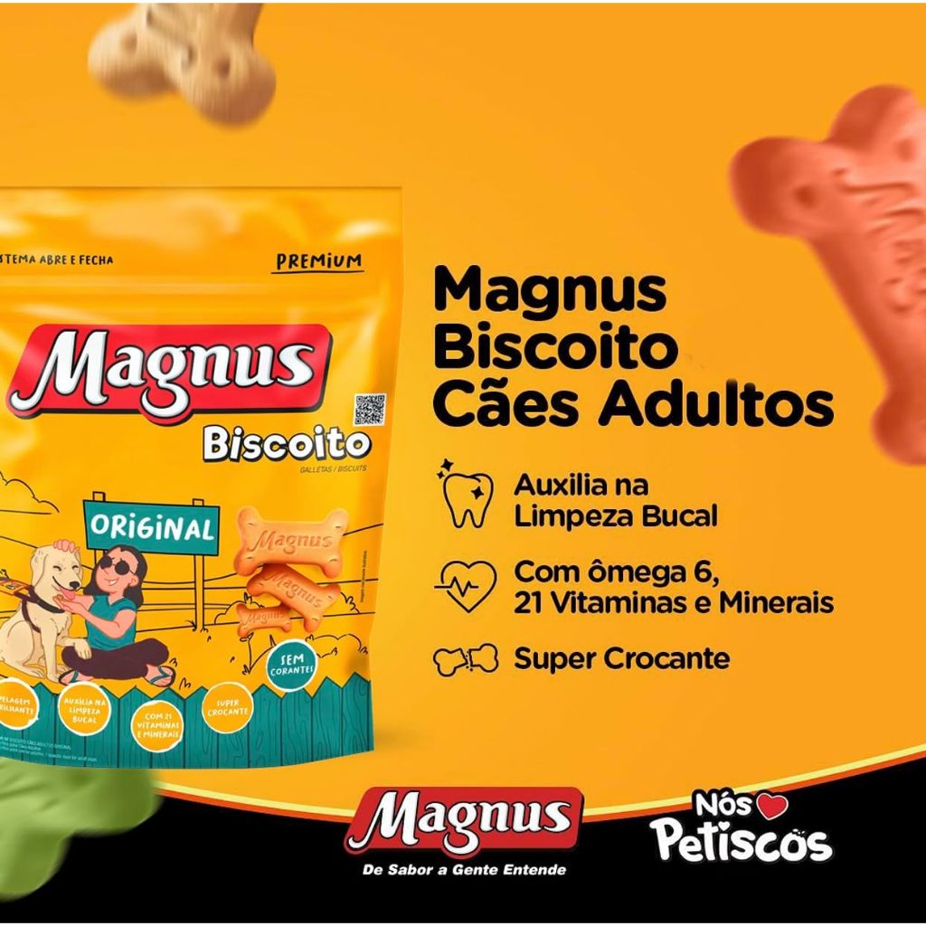 Magnus Biscoito Original Cães Adultos é um biscoito especifico para cães de todos os portes, elaborado com ingredientes especialmente selecionados que proporciona um sabor inigualável, além de auxiliar na limpeza bucal, Pode ser oferecido ao seu cão como demonstração de carinho, em momentos de diversão ou como recompensa em treinamentos.