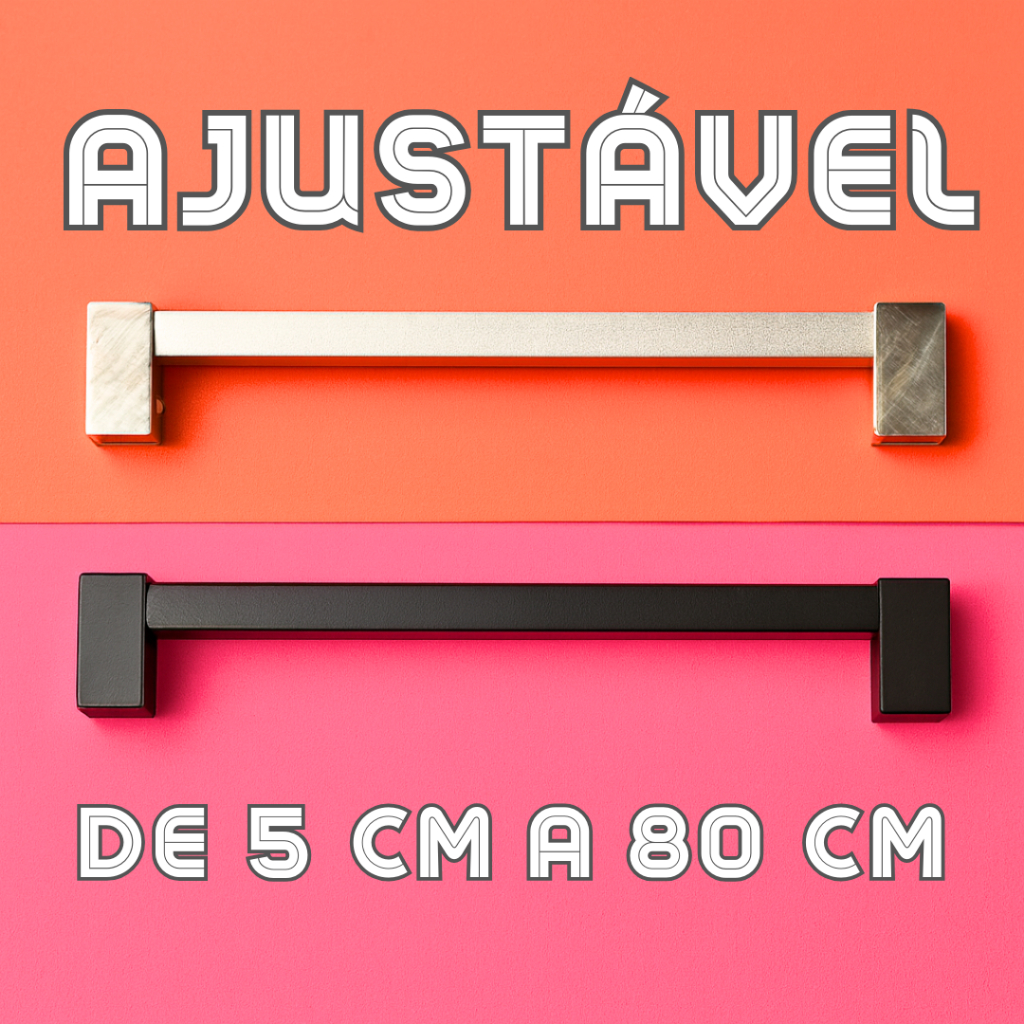 kit 4 peças Os puxadores para móveis são itens fundamentais do mobiliário de qualquer ambiente, sejam salas, cozinhas, banheiros ou até mesmo escritórios. É importante que um puxador, além de bonito, seja resistente e durável, pois, dessa forma, estará sempre influenciando de forma positiva no charme e na sofisticação do móvel e do local em que for instalado. Material: ABS Tamanho variado facilmente ajustável (para ajuste veja o vídeo) tamanho A - ajusta de 5cm a 22cm. tamanho B - ajusta de 5cm a 35cm. tamanho C - ajusta de 5cm a 51cm. tamnho d - ajusta de 5 cm a 80 cm Para mais informações entrar em contato